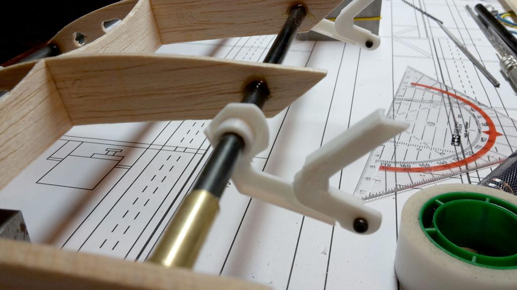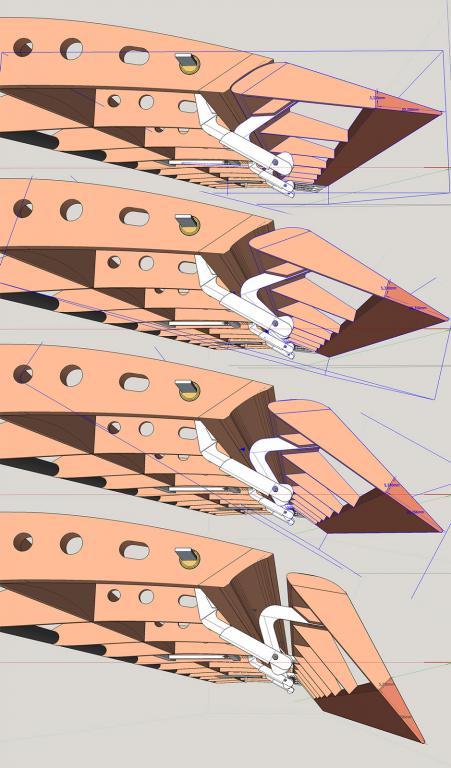 Vingarna och framför allt kontrollytorna krävde en del funderande och caddande. Ritningens flaps skulle göras större och få en mer skalalik profil. På originalet är flapsen i princip 2/3 av vingens längd och skeven 1/3. Min modification slutade med att jag förlängde vingen en "sektion" för att få lite mer vingyta vilket gav 6 fack flaps och 4 skev, inte riktigt lika extrem som originalet. Ritningens flap var av enkel “tvärhuggen” typ och här ville jag försöka efterlikna originalets glidande Fowler flaps(?). Det blev en kompromiss med en ganska lik profil men inget glidspår innan de viker sig nedåt. Med gångjärnspunkten bakom och en bra bit under flapsframkanten tycker jag att jag fick en bra rörelse som genererar mer vingyta i början av rörelsen. Ursprungstanken var att göra gångjärnen i 0,5 mm aluminium men detta visade sig för svårt, framför allt att få de 6 gångjärnen identiska. Men så insåg jag att det skulle bli starkt nog 3D-printat. Detta var lättare repeterbart… och infästningen i vingen en barnlek. Konstruktionen av flapsgångjärnen innebar också att jag kunde fästa stötstången mellan gångjärnspunkten och flapen i centrumgångjärnet och helt slippa separat horn. Blev riktigt snyggt om jag får säga det själv =)
