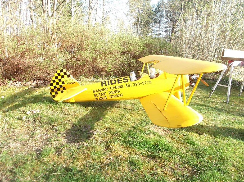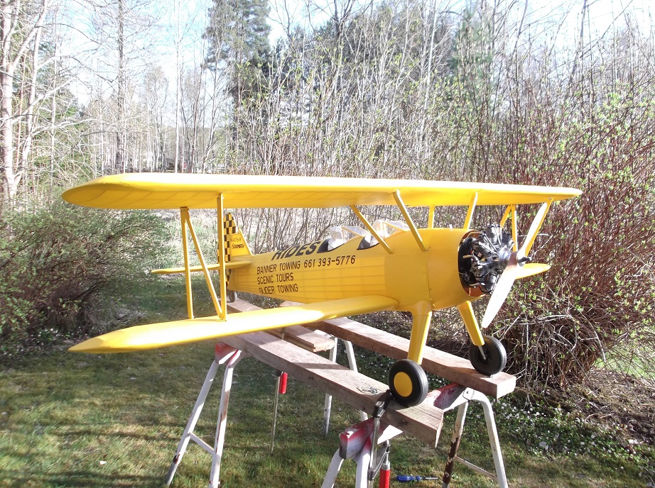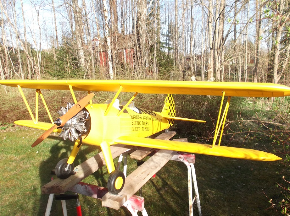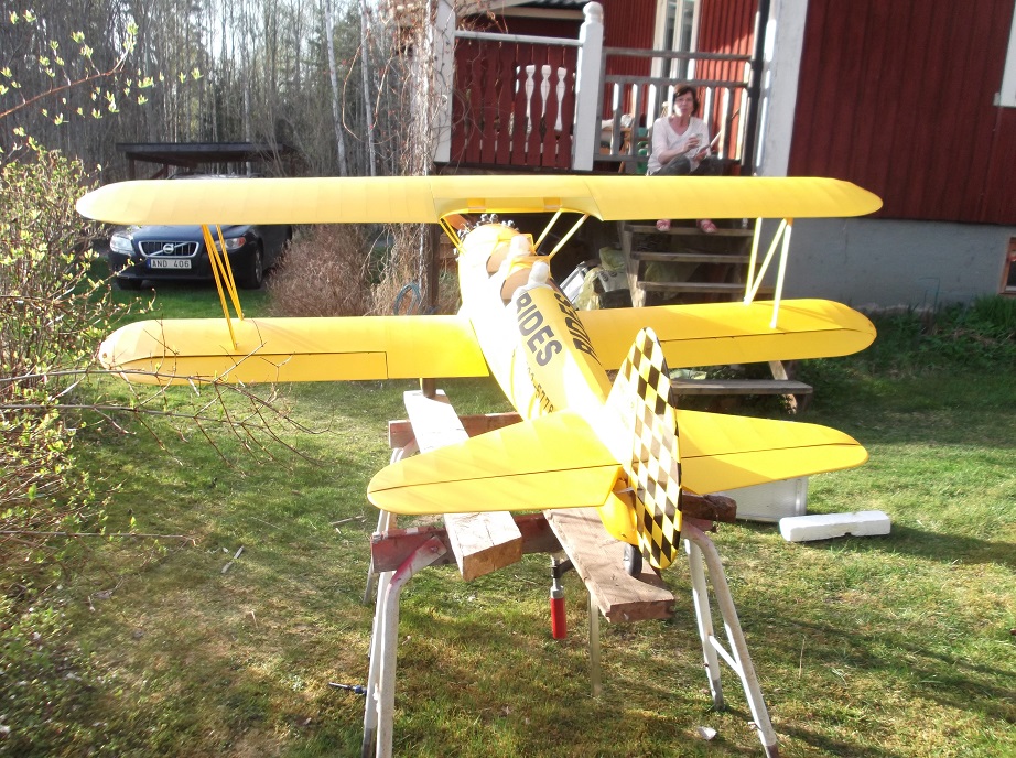 Idag var det äntligen dags att ta Stearman´en ut och sätta ihop den. Och dessutom kolla tyngdpunkten. Det tar ganska mycket tid att skruva alla skruvar i... 8 till vingerne, och 12 till vingstötarna. Tog lite kort på den. Tyngdpunkten ligger nästan där du sa Lelle, så det bara lite finjustering kvar. Pilotgubbar följde också med på köpet. Aces of Iron figurer. Just nu lite bleka, men de skal få färg en dag. Tyvärr har jag lackat texten med akrylspray. Den är inte bränslefast, så det återstår att ge all text ett par skikt matt klarlack!