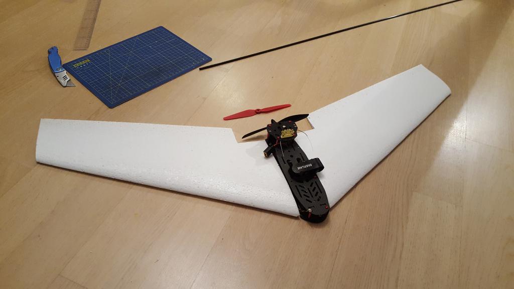 Hursomhelst så gillar jag att bygga grejer men det är en massa saker jag inte kan om det här - och upskattar lite hjälp av dom som kan. Har tidigare flygt lite vinge och blixler 1 - men annars flyger jag mini race quads. Nu vill jag ha en vinge som är rätt snabb och flyger stabilt o rakt. Jag och en kompis har redan skurit ut vingkärnorna i vanlig cellplast samt den rosa. Vingprofilen är S5010 10% https://www.aerodesign.de/english/pr...le_s.htm#s5010 - den verkar rätt lovande, vingspann är 880mm. 2st 5mm kolfiberrör förbinder o förstärker vinghalvorna och tunnare lister skyddar vingens framkant, testvingen är klädd med aluminium tejp som verkar fungera bra men ser rätt fult ut.