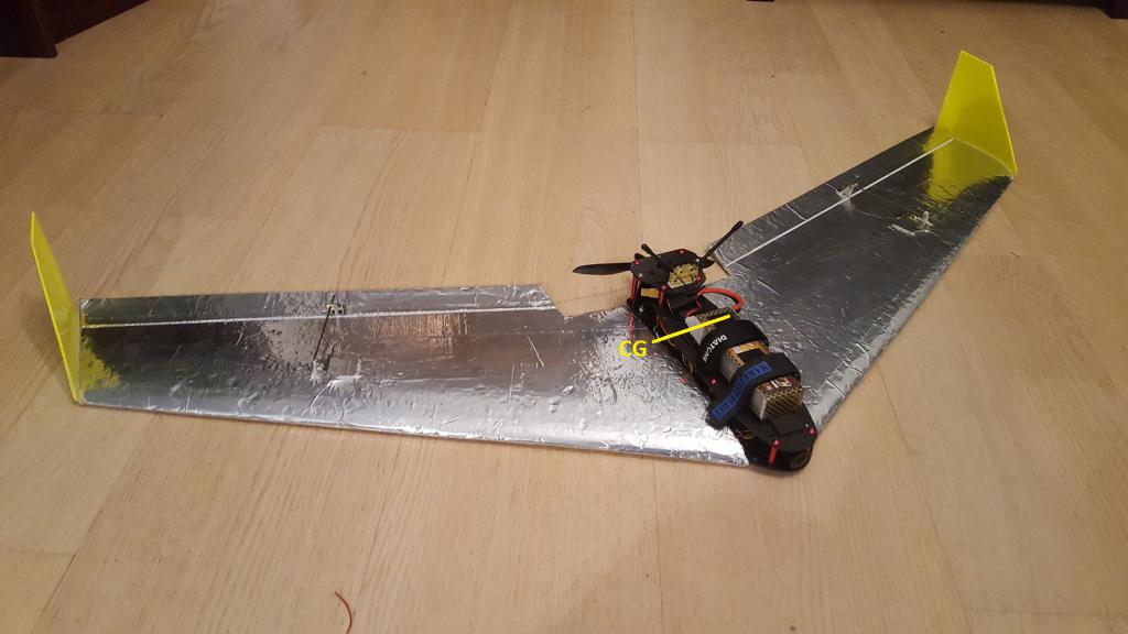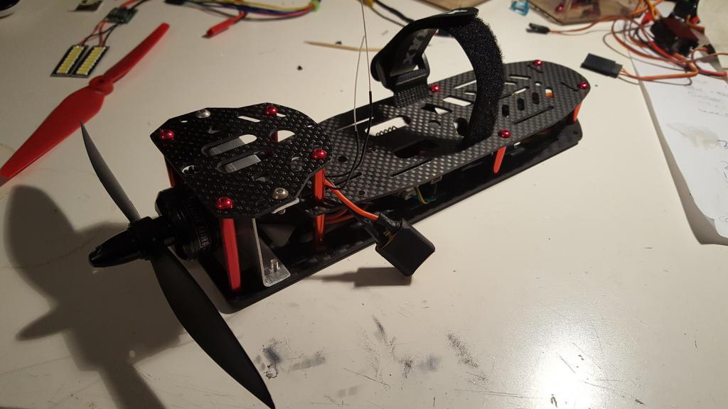Använder en omlindad Cobra 2206 motor med jättemånga kv (7 varv istället för 10) och 3s 2200 batteri och 9g servon - totalvikten utan FPV är ca 450g. I kolfiber kroppen som är en massa kvaddade quadcopter skal egentligen sitter det en F3 styrdator med cleanflight på mestadels för telemetri hantering, men även så att den kan stabiliseras vilket är andvändbart eftersom jag startar den vertikalt rakt upp som en tintin raket.
