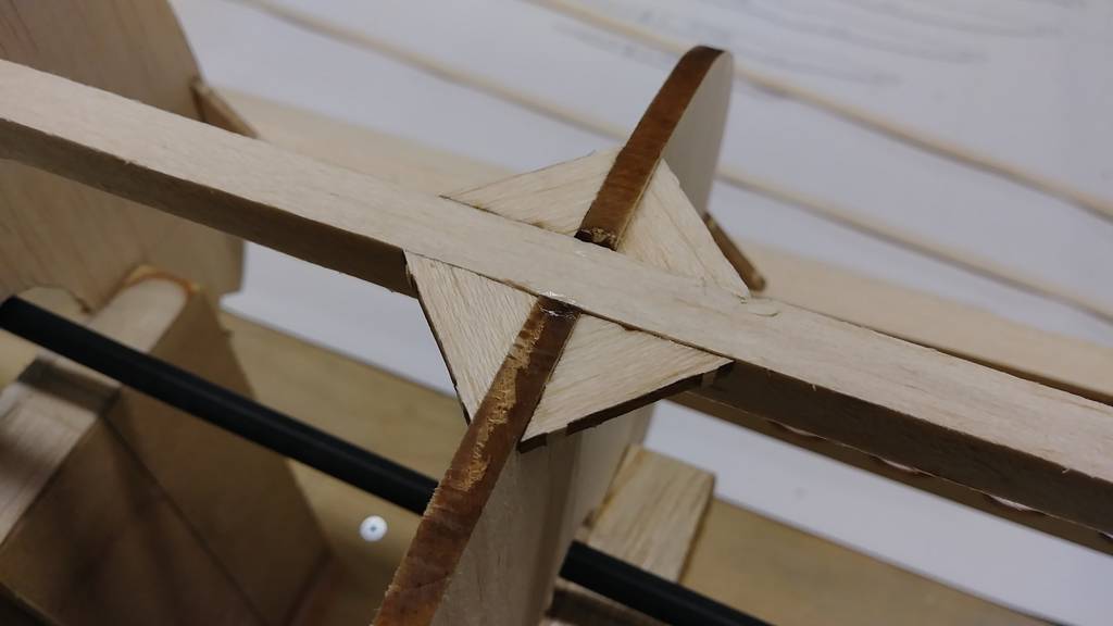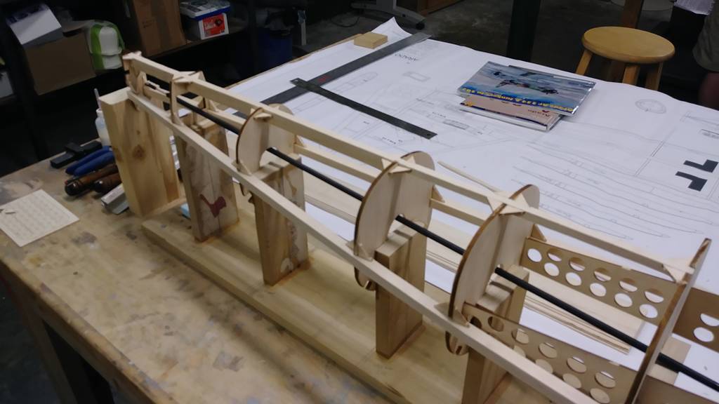 Mittendelen av kroppen byggs upp runt vingsadelstyckena och här kommer skidans låda att hamna. Alla de spant som berörs av lådan har förberetts for detta.