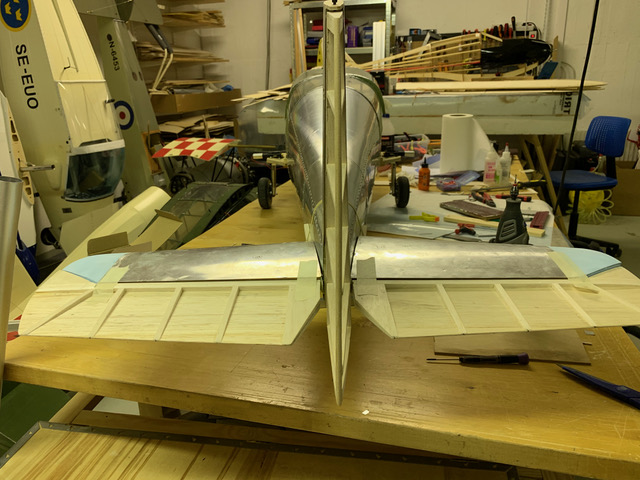 Har också börjat med sidorodret. Det är skränkt 9 grader åt höger i toppen som på orginalet. Nosdelen på rodret är en kärna av blå frigolit som slipats till och klätts med gråpapper/vitlim. Blir ganska lätt och vridstyvt och kommer sen att kläs med Solartex (har några rullar på lager sedan tidigare).