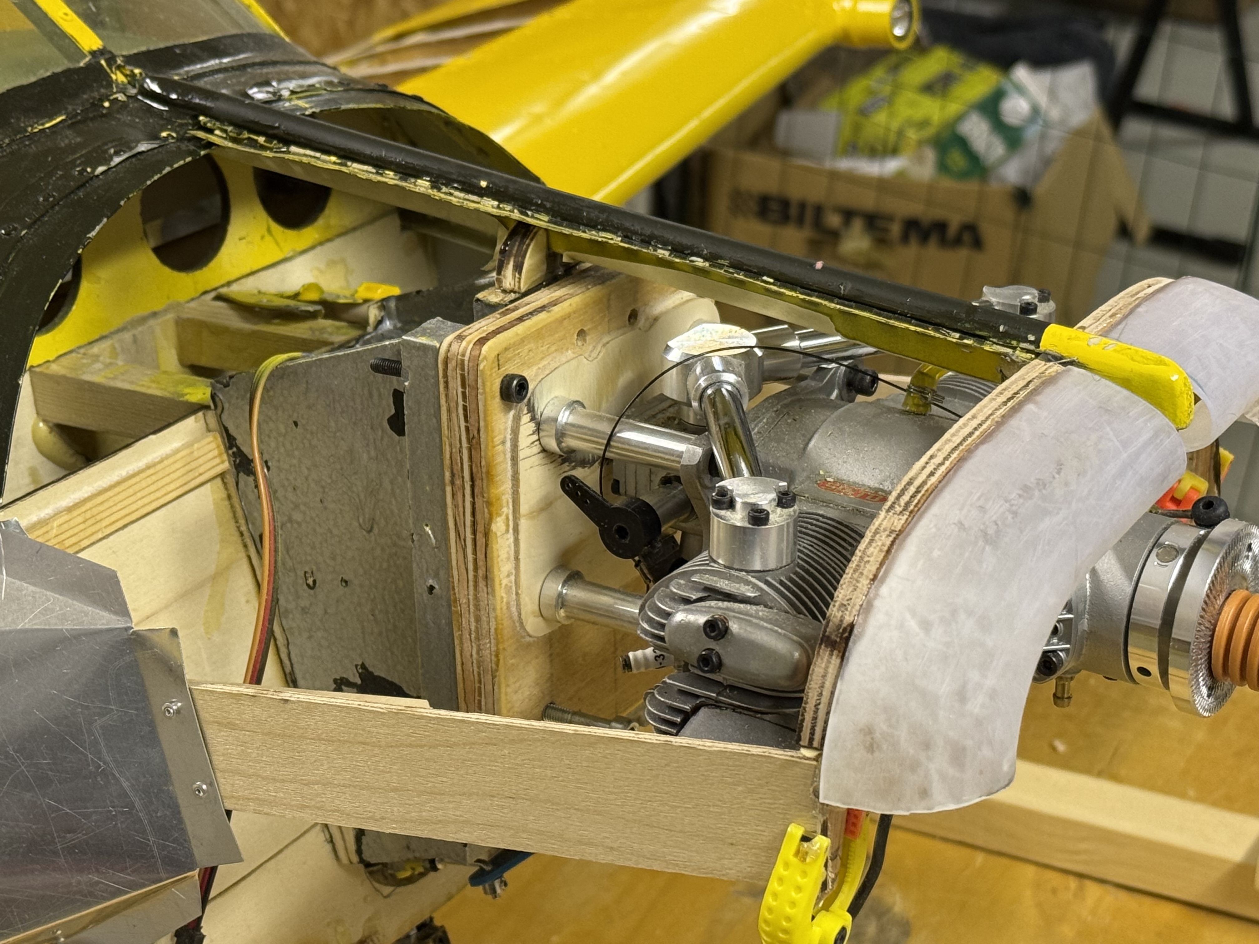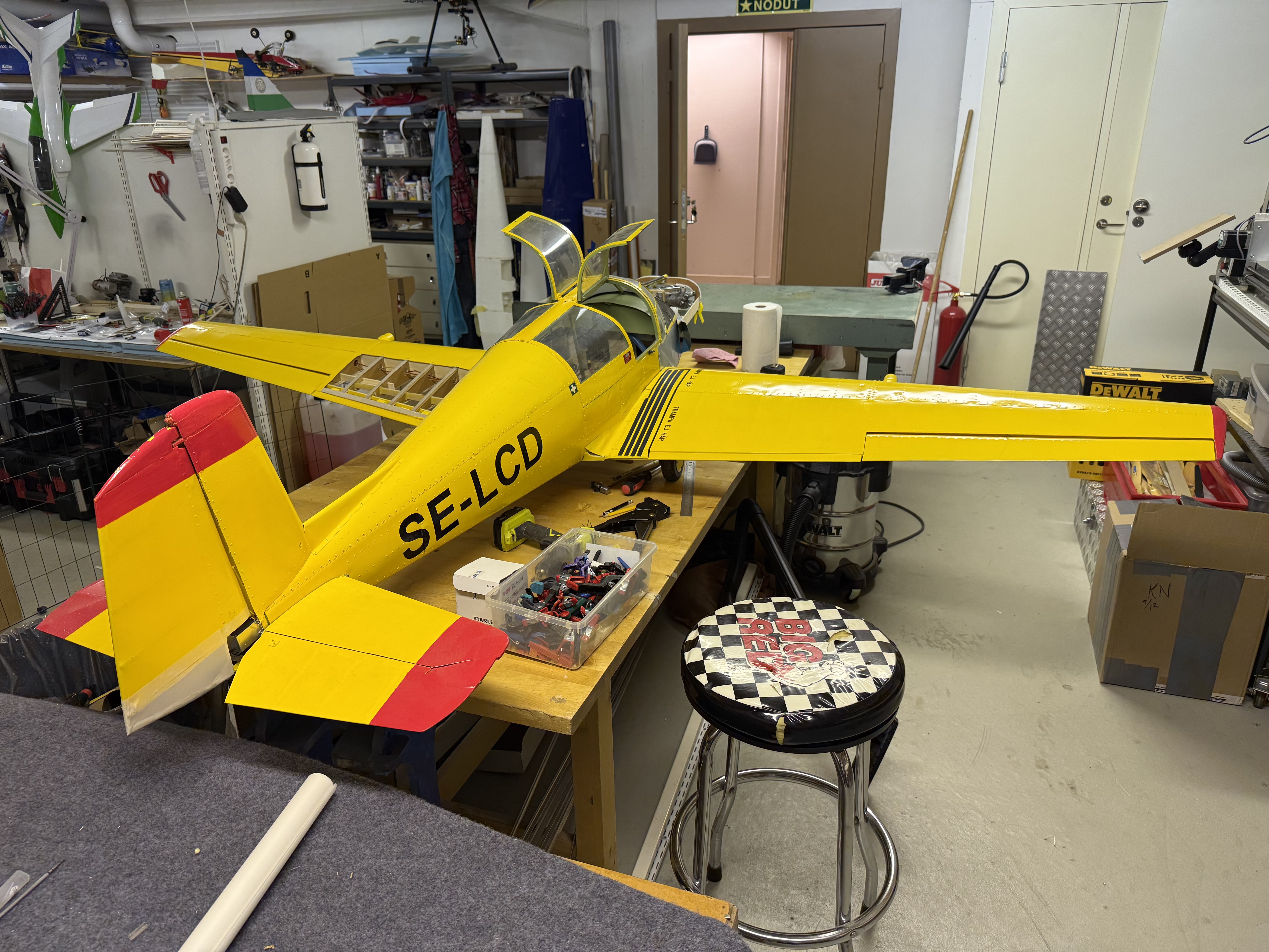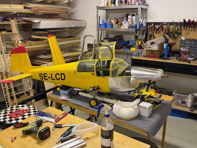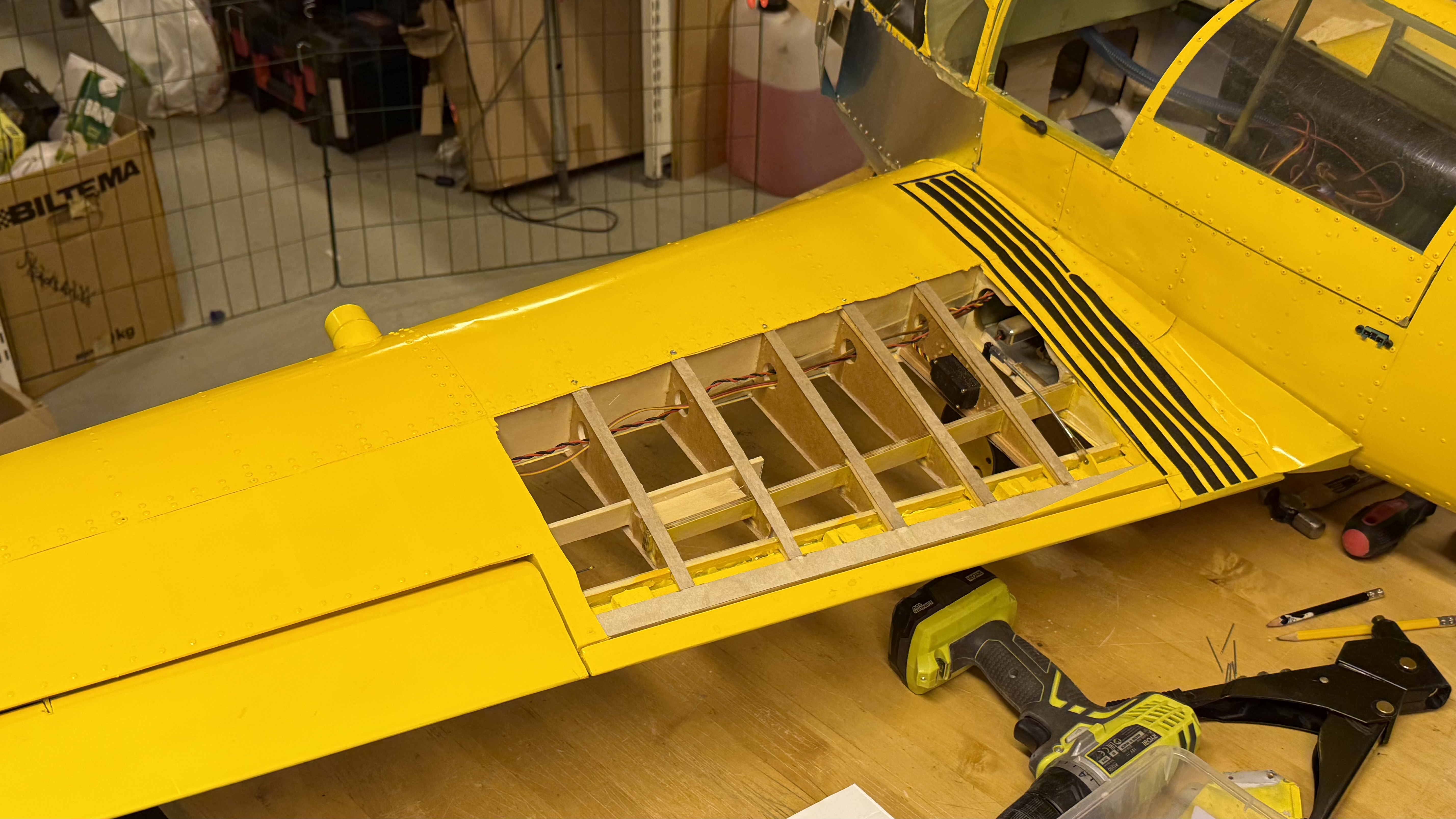 Reparationen går sakta framåt. Stommen för noskåporna och "gälarna" på plats. Vänstra vingens spryglar förstärkta runt bakre balken där flera var knäckta. Kommer att bli lite trixigt med klädseln här den den från början var klädd innan plåtklädseln sattes dit...