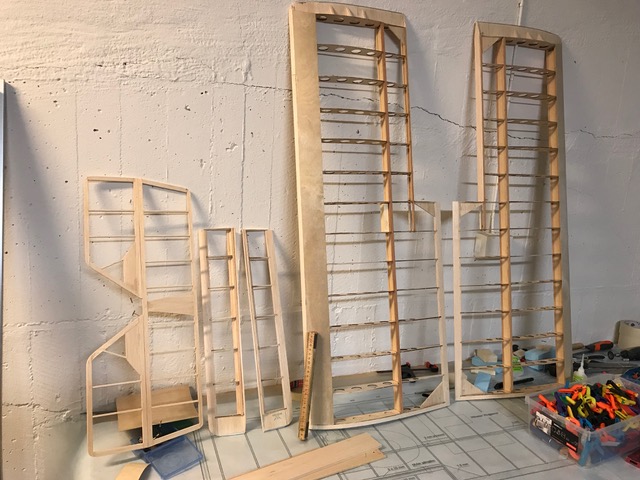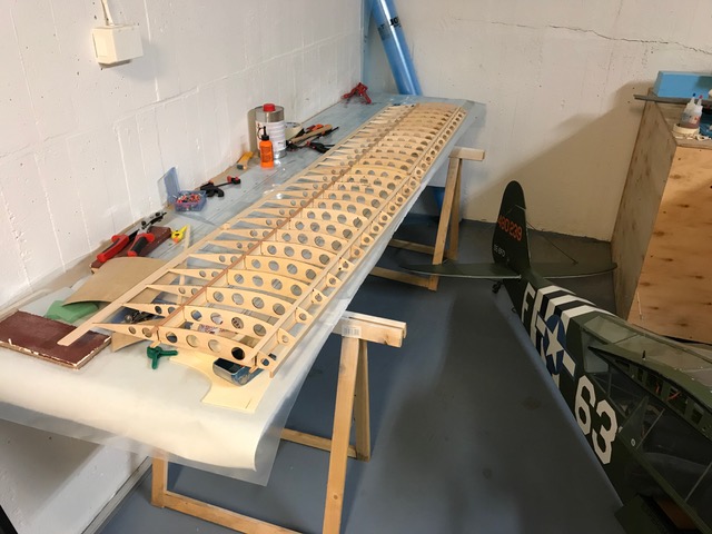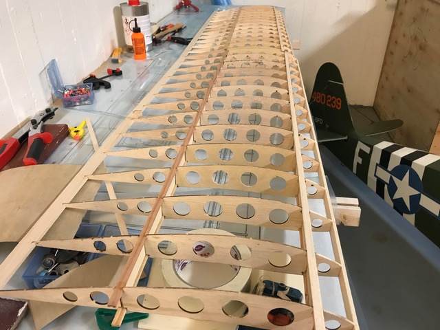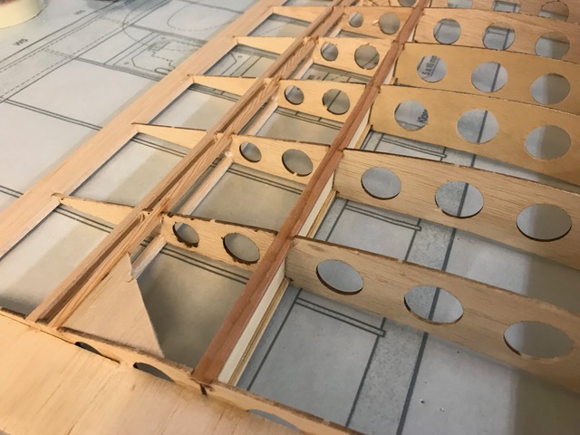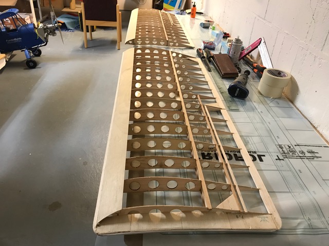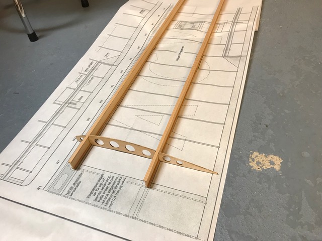 Vingbalkarna är uppbyggda som I-balkar med furulister och en stående mittdel lätt-plywood. Den är limmad i ett fräst spår i furulisterna. Spryglarna har profilen från originalritningen även om bygget till viss del sker på en förstorad MJD-ritning.