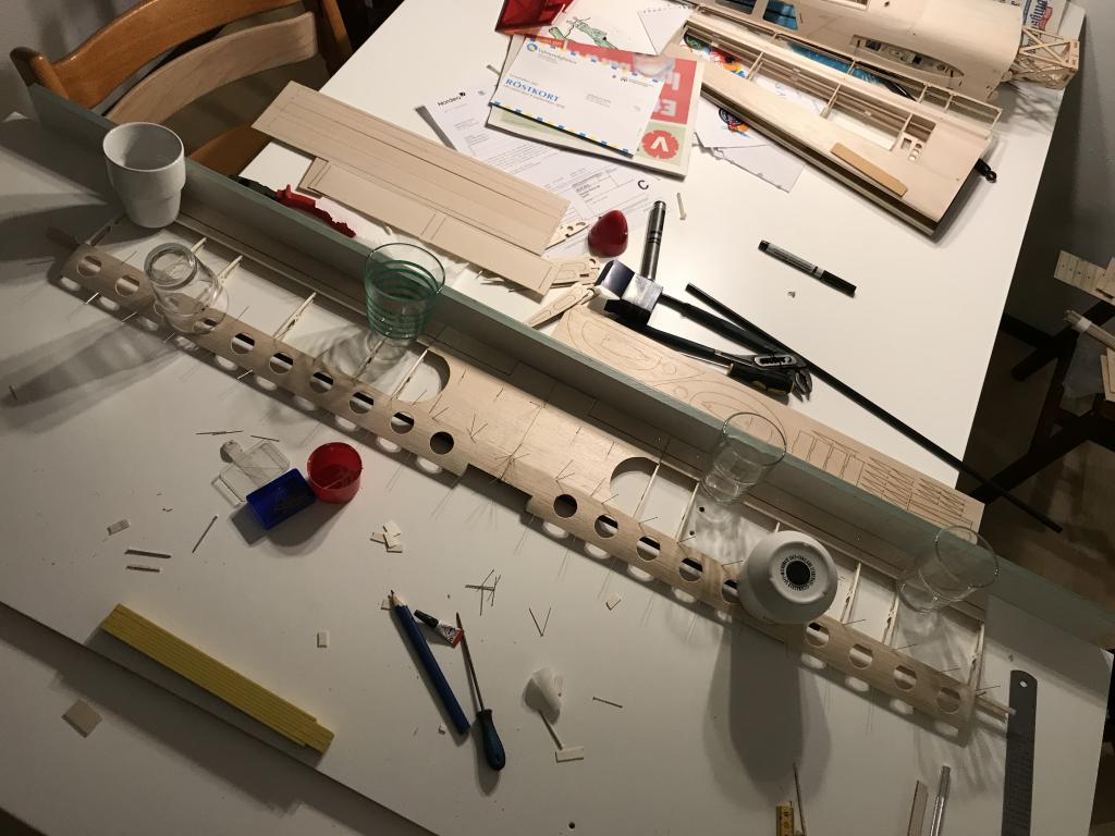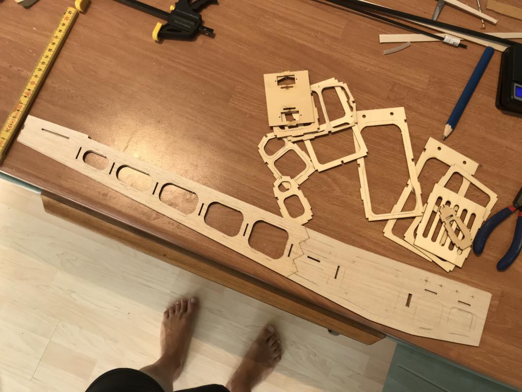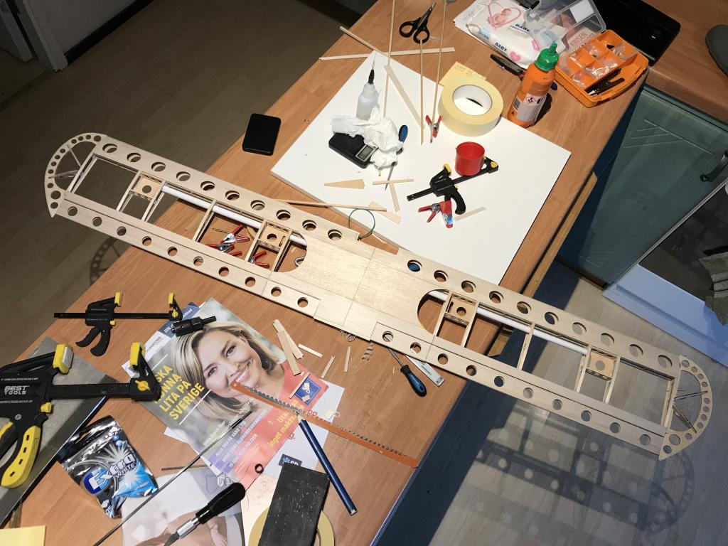 Anvisningen var att bygga vingarna i två delar och det ville inte jag samt att jag klämde in ett kolfiberrör som förstärkning i samband med det. Har även bytt ut till 3x3 kolfiber balkar i kroppen som förstärkning.