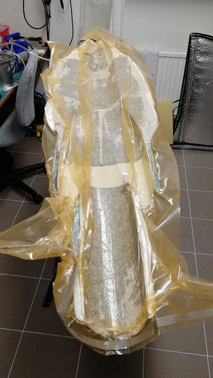 Tanken är en lätt konstruktion med glasfibersandwich, troligen blir det 50-100g glasfiberväv på varje sida av 1,2 eller 2mm Airex skiva. Airex skivan ligger i vikt något lägre än vad lätt balsa brukar väga.