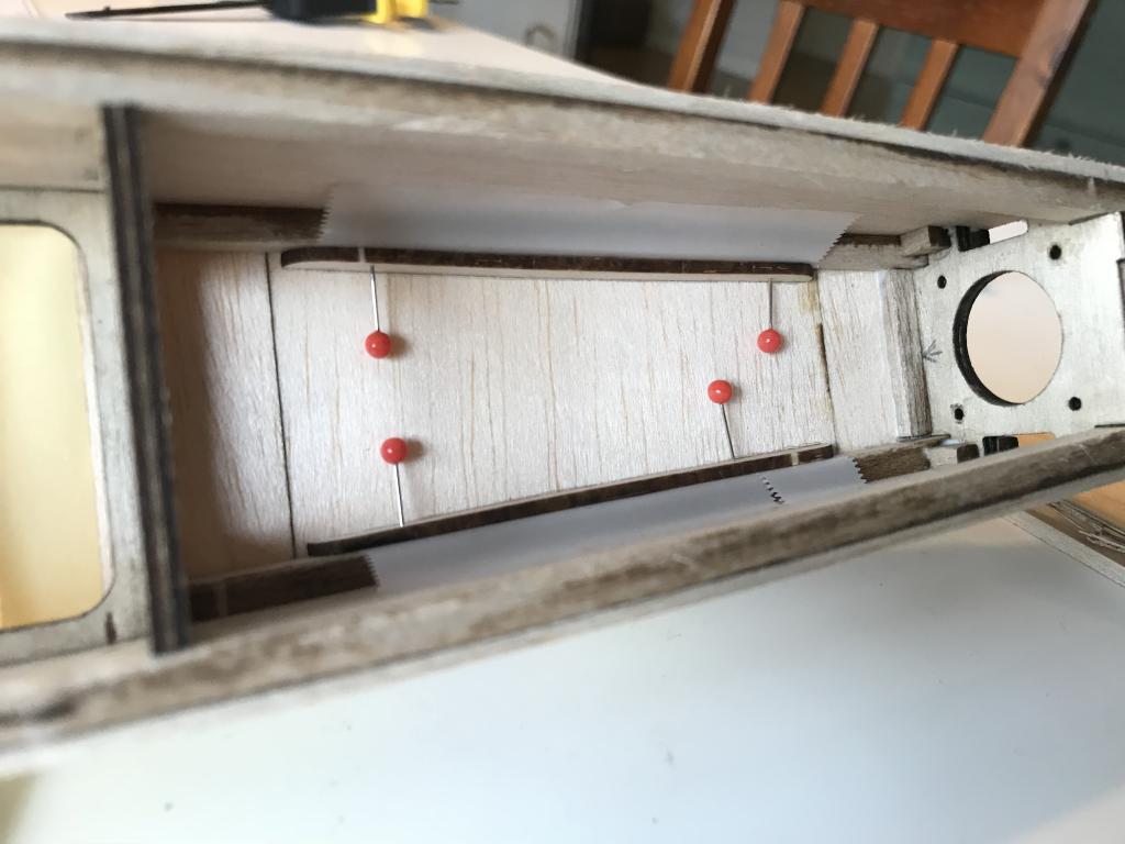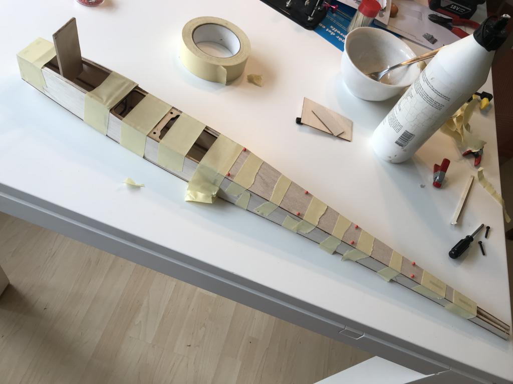 Här har vi limmat överdelen av kroppen, tejp är alltid bra och små nålar för att hålla fast kroppsidorna på rätt ställe !