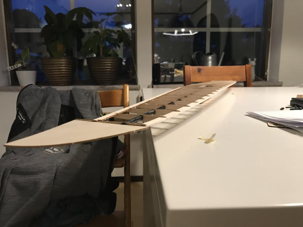 Den andra vingen jag gör nu kommer plankas hela och då tänker jag slänga ut servona 2 fack så roderhornen blir mer åt mitten än på kanten.