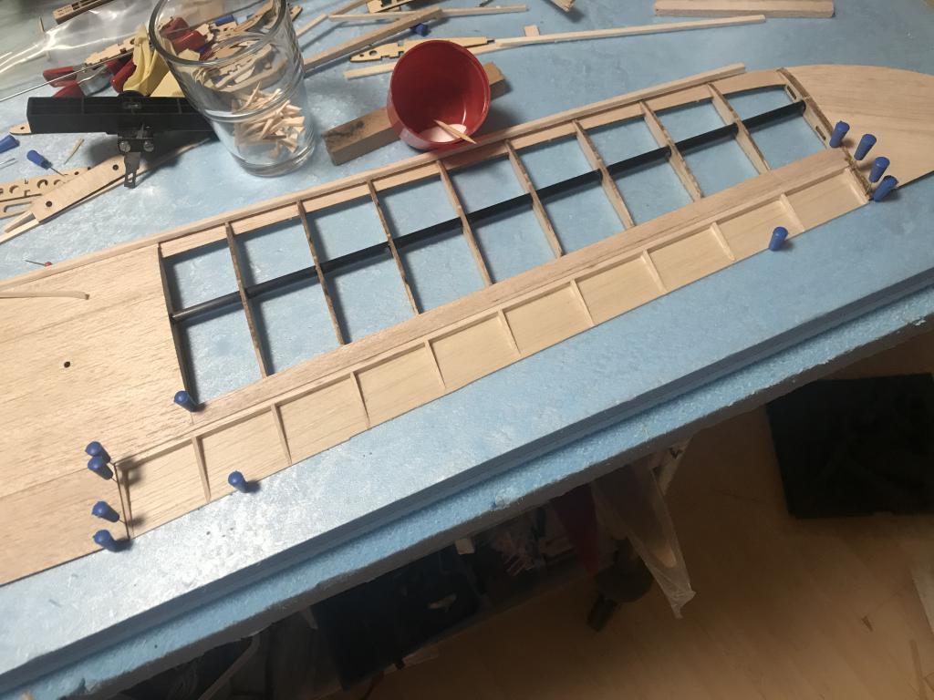 I samband med att det är en plankning ovan och under känner jag ingen vits med det, den lappar över/går omlott vid skarven där listen möter sprygeln. glöm inte att du har ett 6mm(5.8) kolfiberrör genom hela vingen