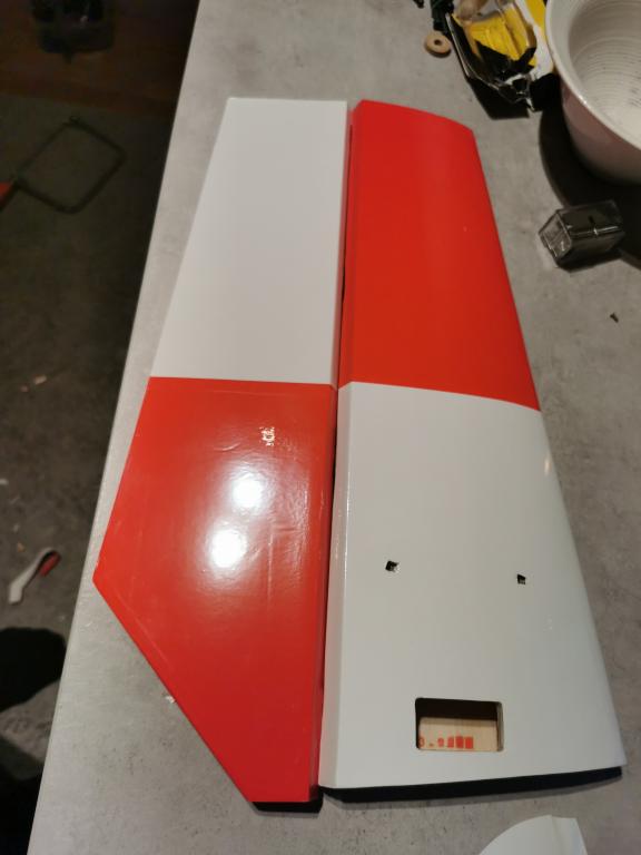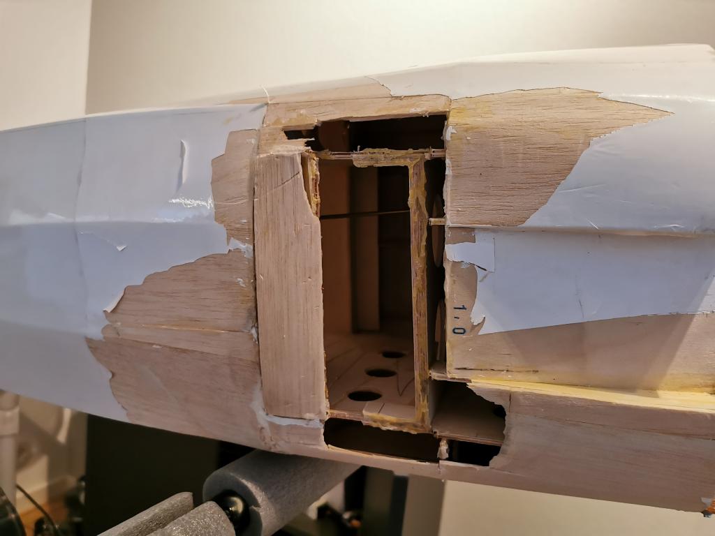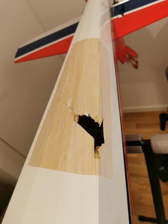 Tog tyvärr inga bilder på skadorna på vingarna, men det var hål rakt igenom båda vingparen och diverse andra småskador. Allt är nu lagat och ny klädsel är på.