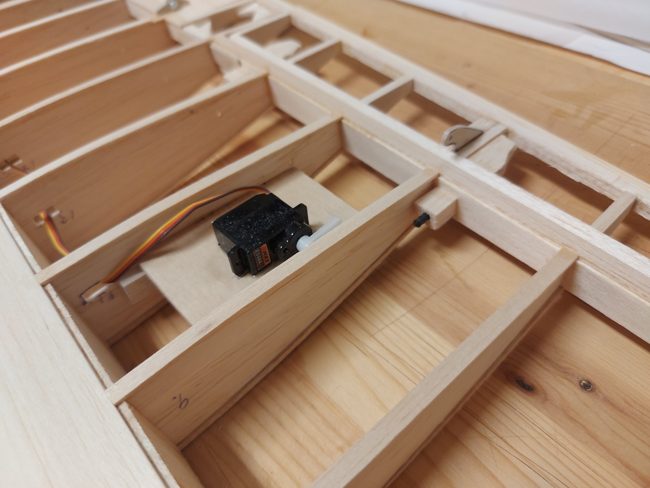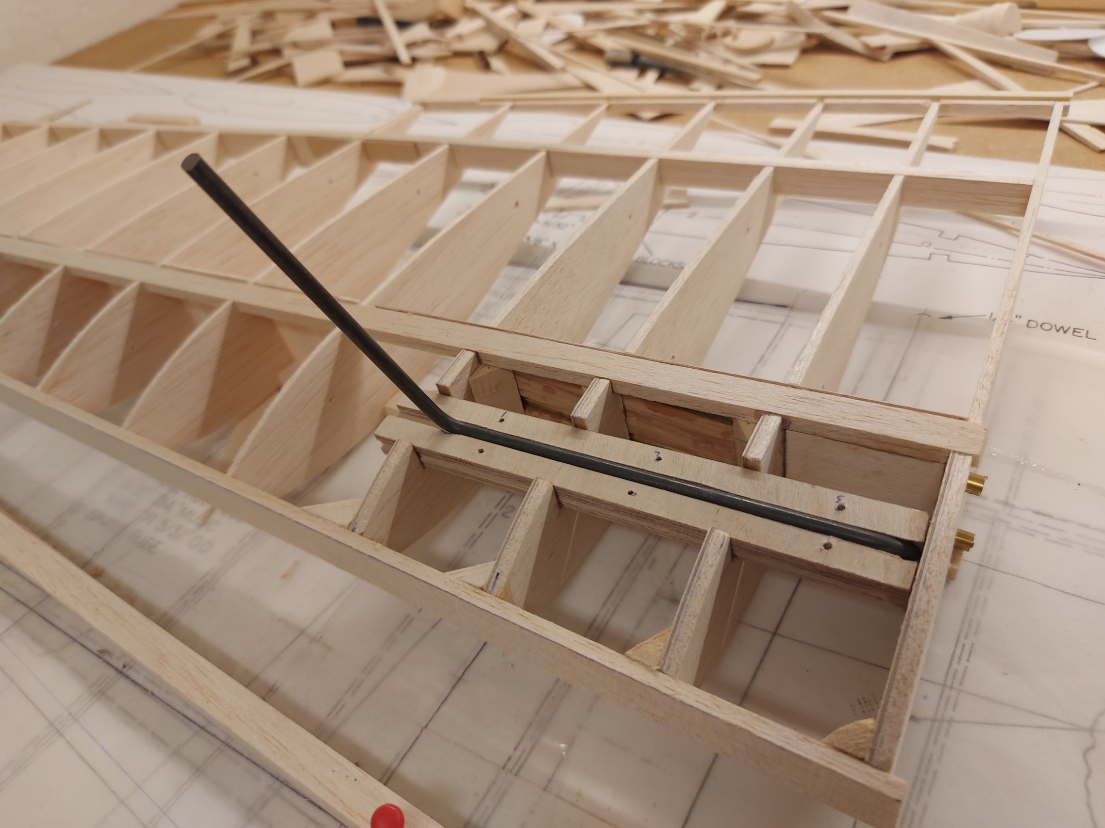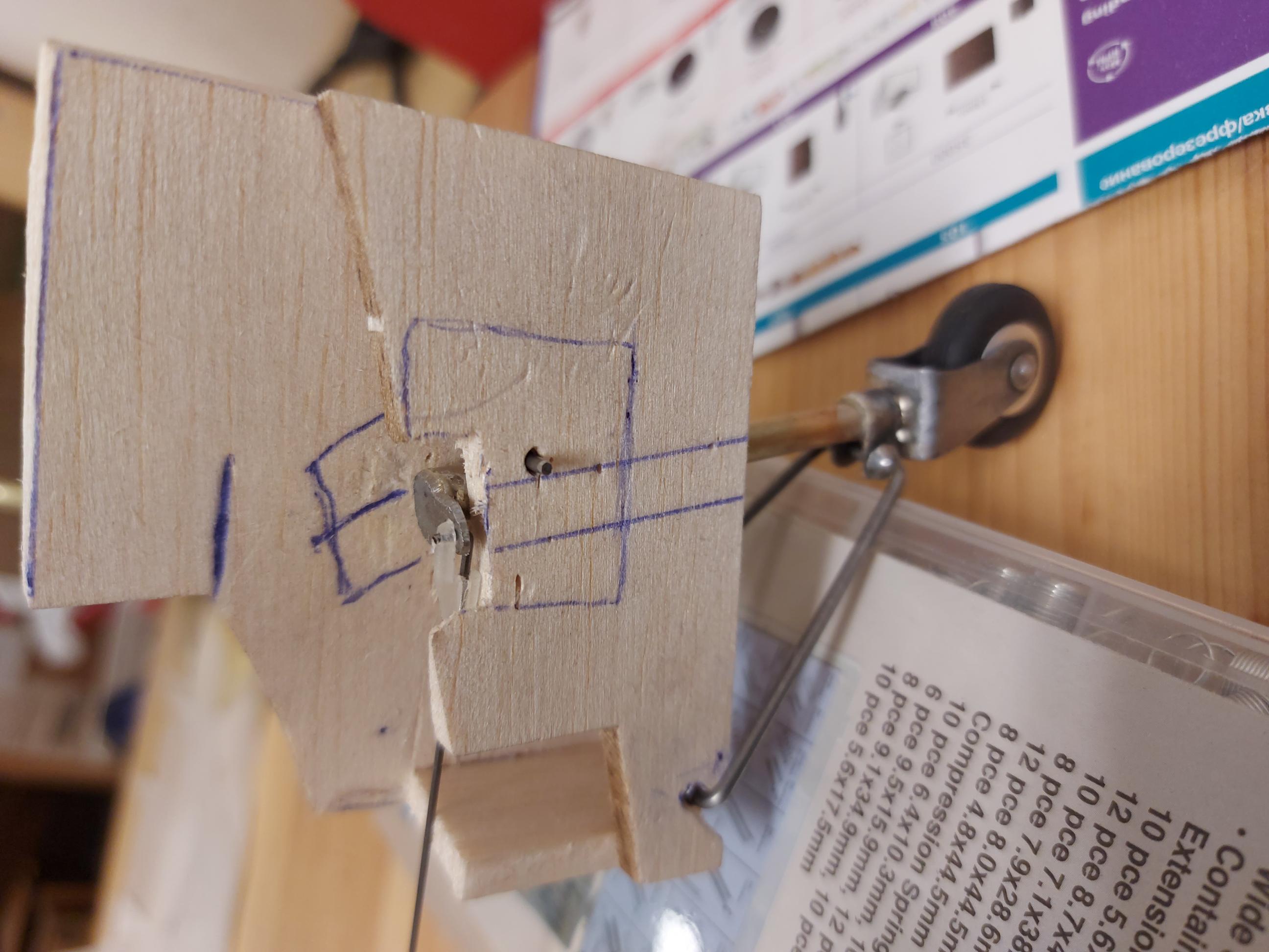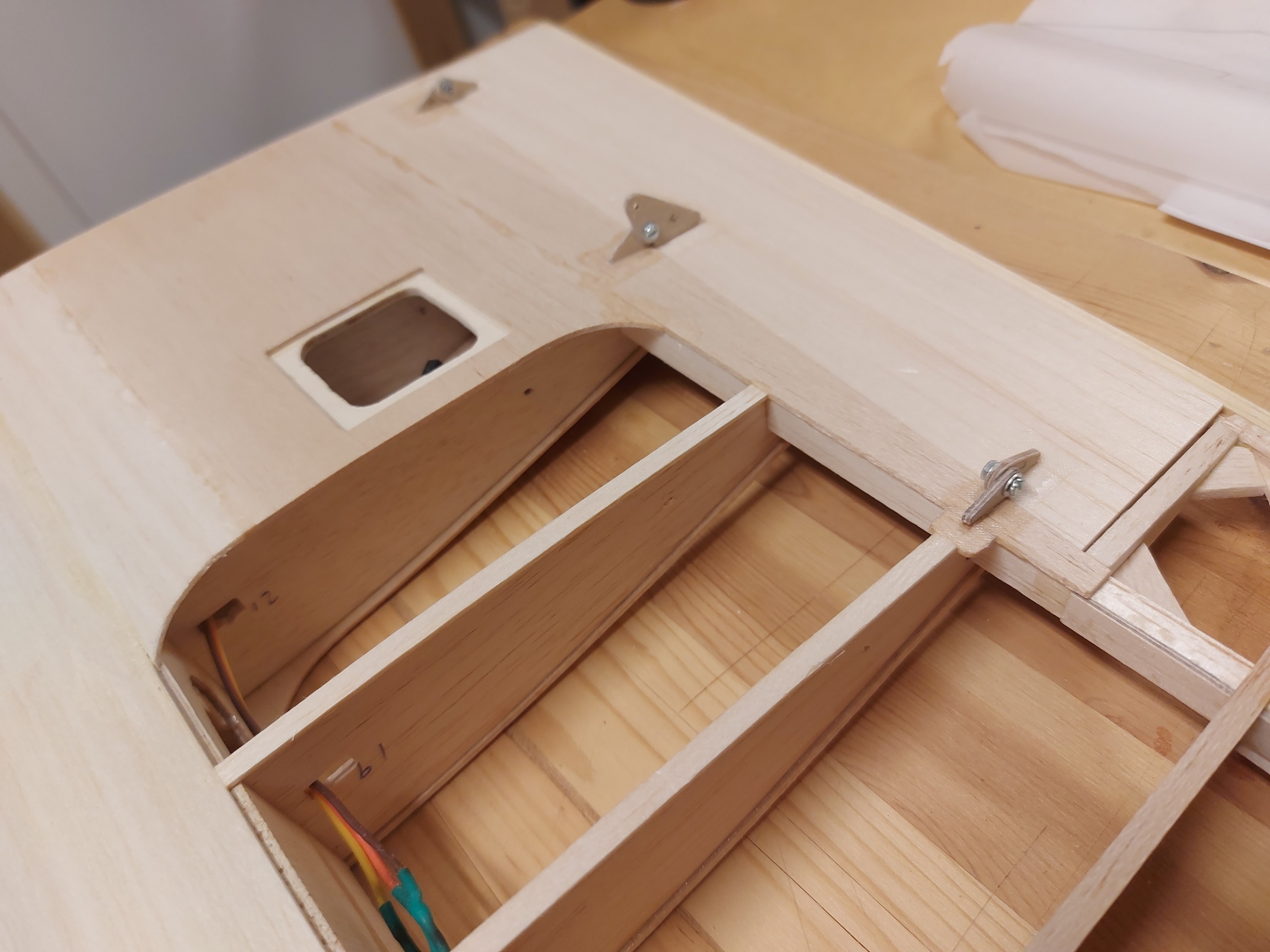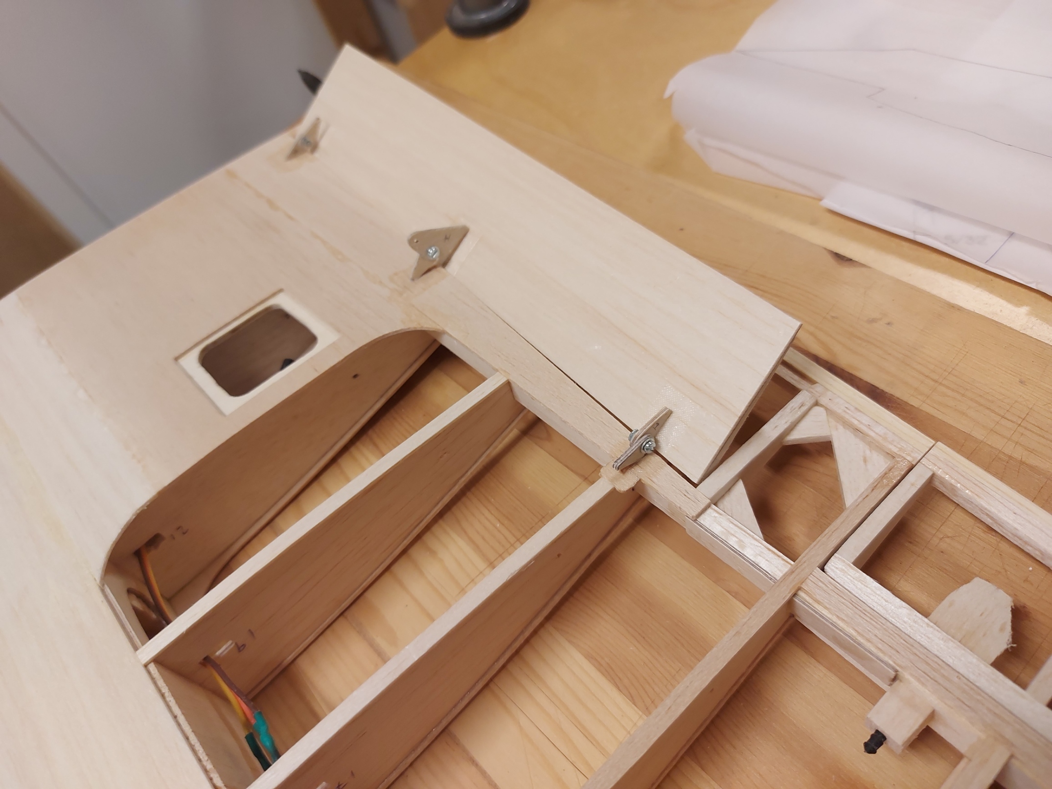 Sen låste jag vingen med en fjädrande pianotråd i bakkant, plus en skruv i framkant.