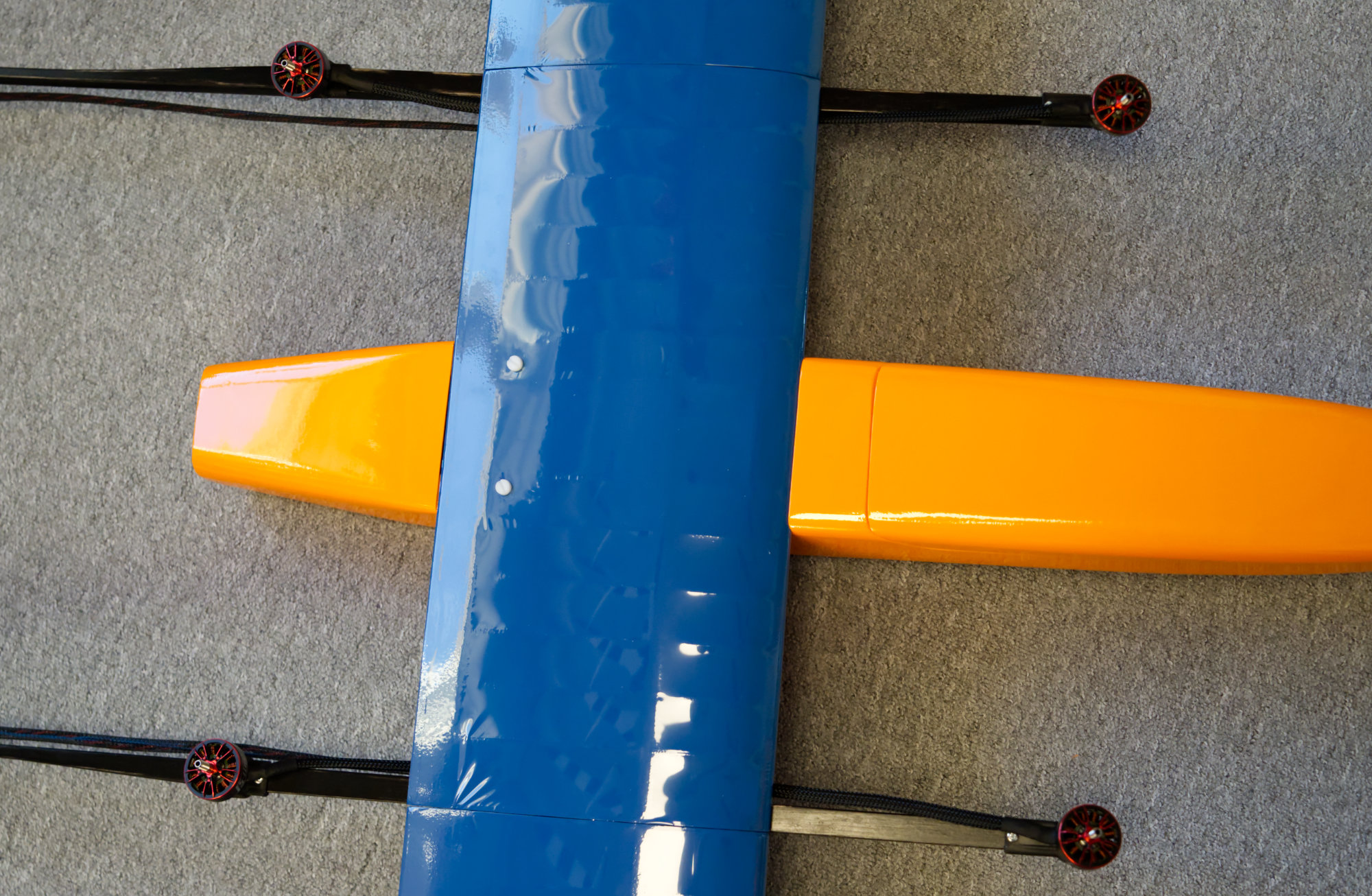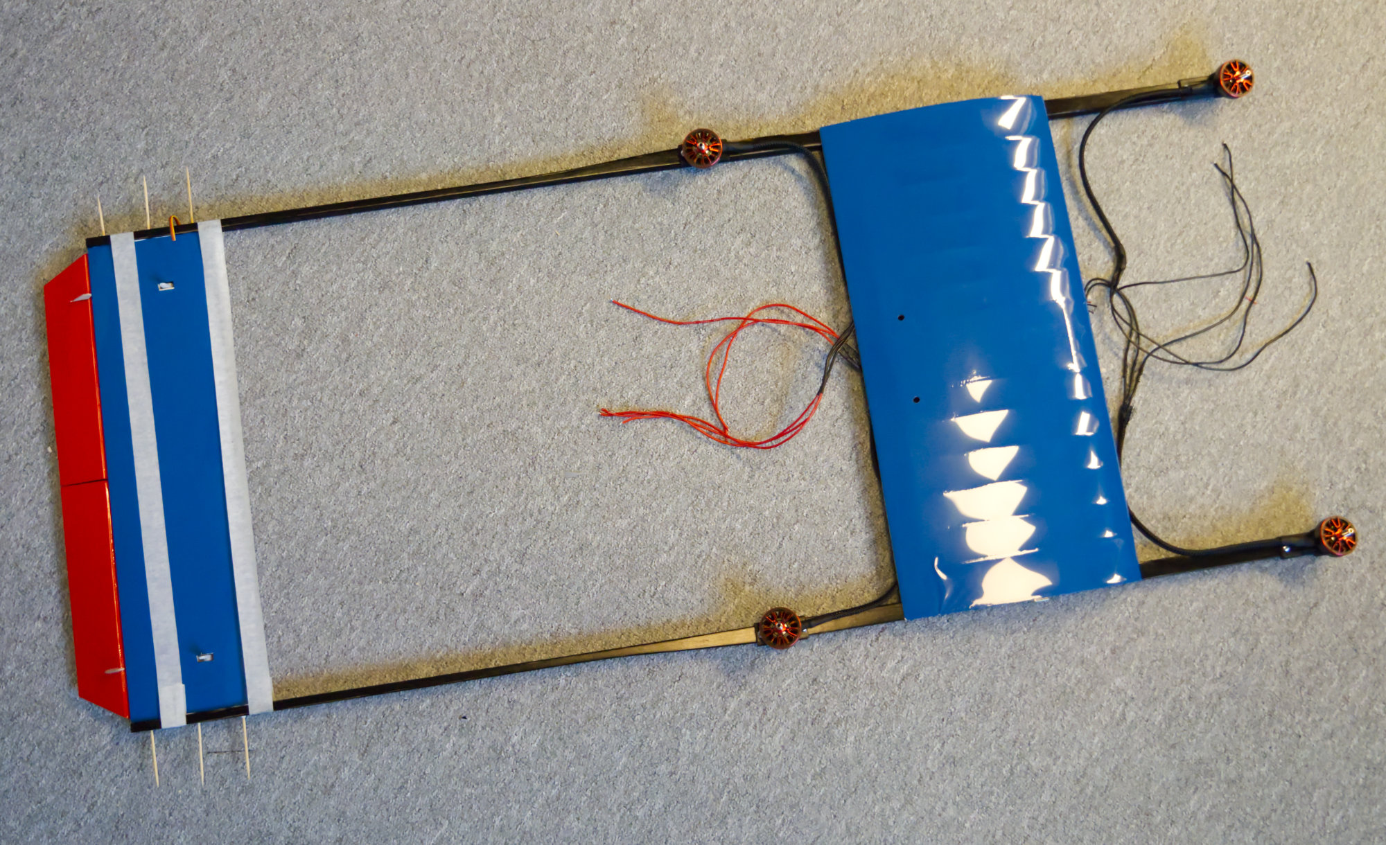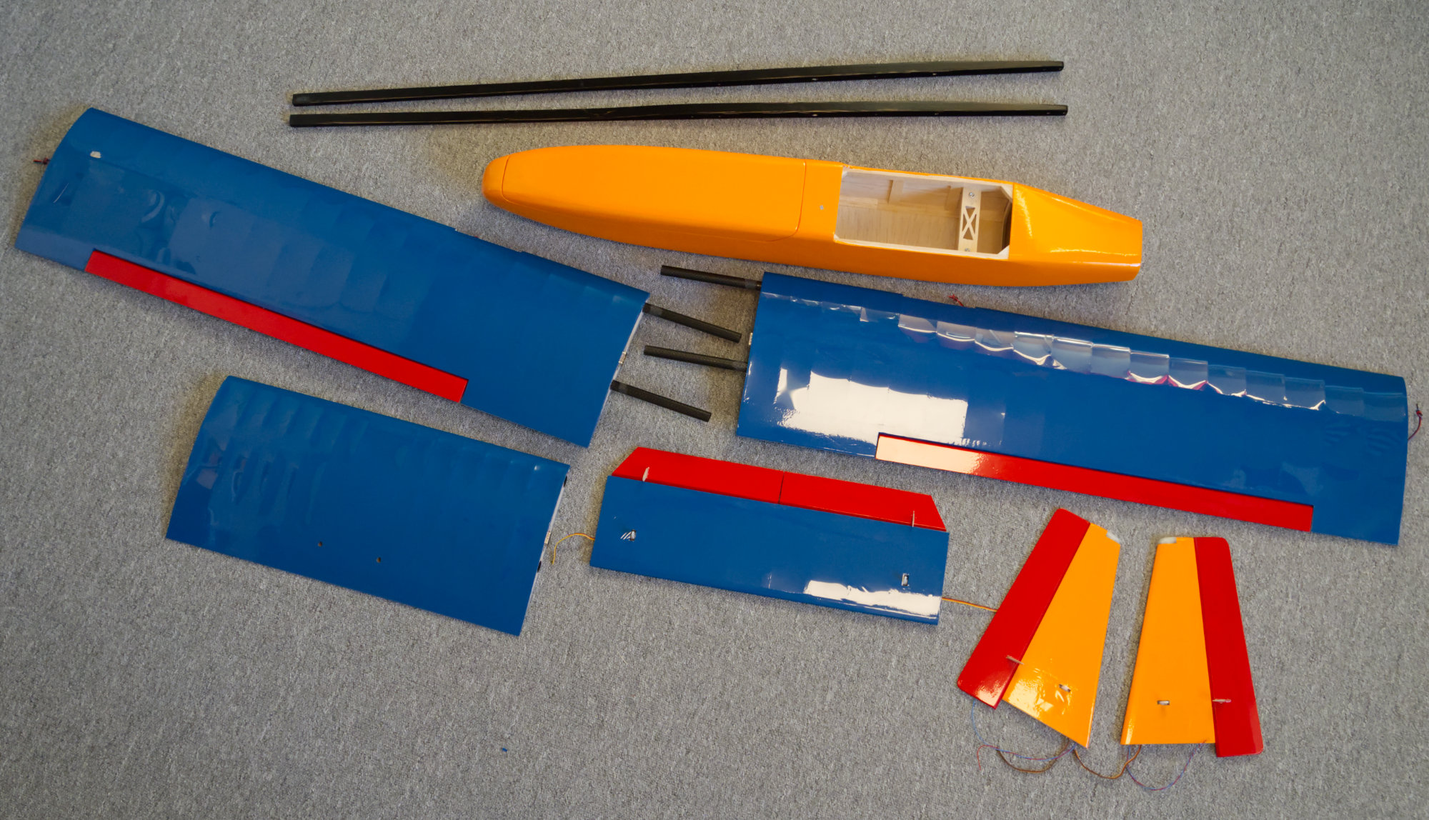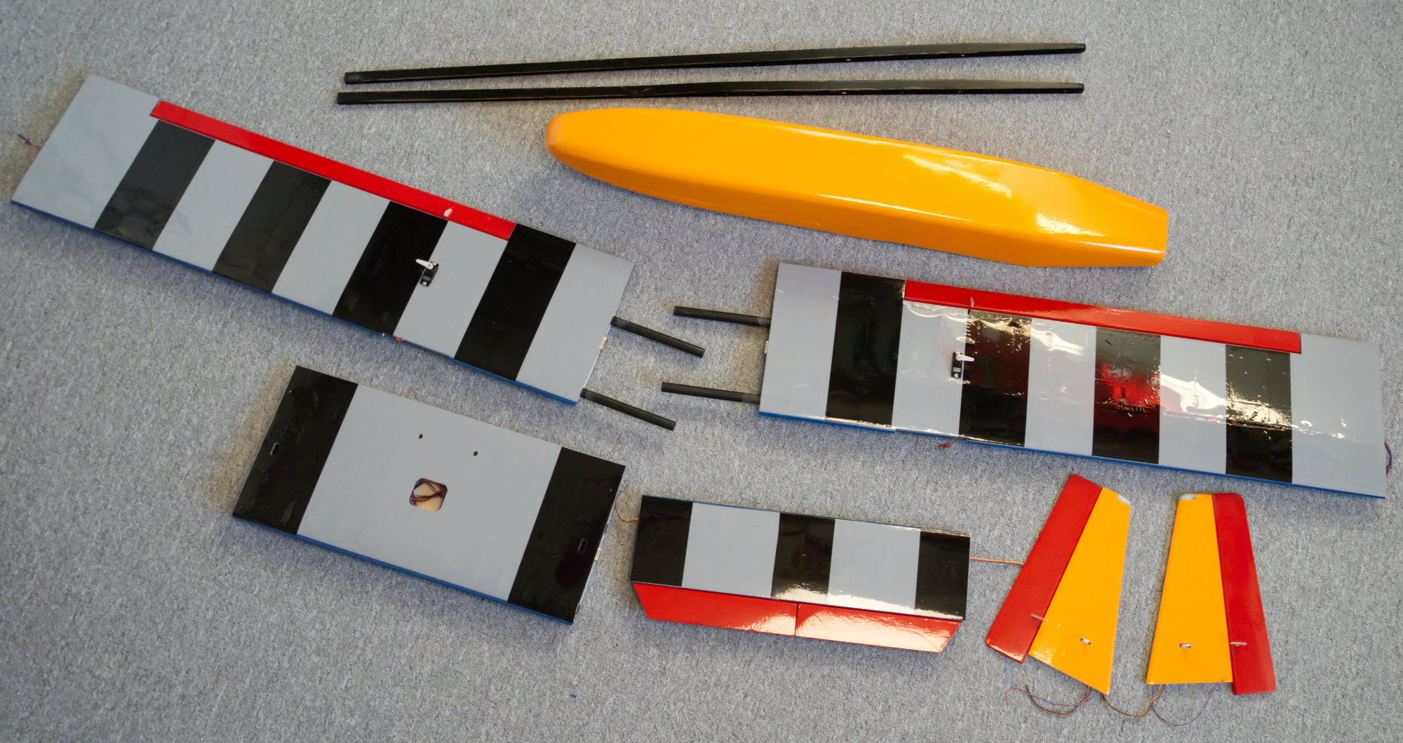 Då var alla delar färdigklädda. Majoriteten av beklädnaden som användes är från Hobbyking, inköpt för flera år sedan. Lite småbitar av Oracover också. All platsfilm var bitar jag hade sedan tidigare, inget är köpt till just detta flygplanet. Tanken med färgtemat är mest att inte efterlikna några kommersiella UAVer, därför ville jag inte göra den helt vit eller grå eller liknande.