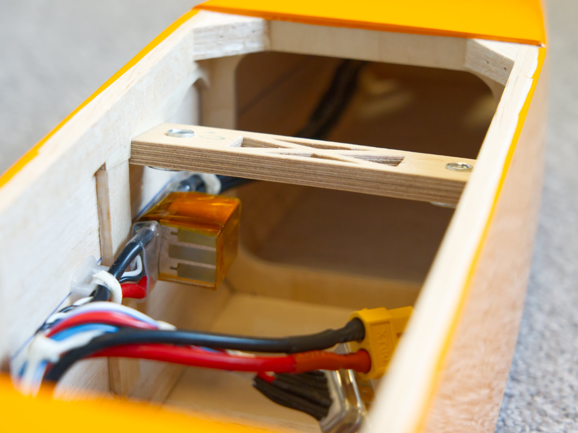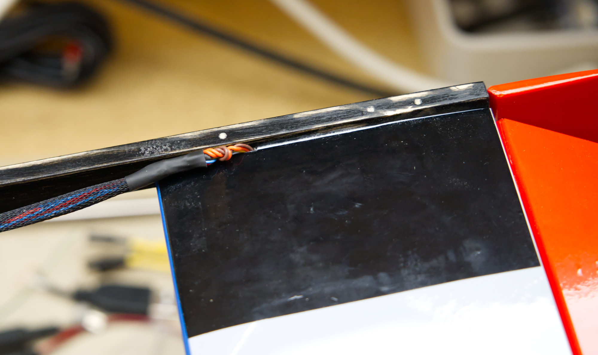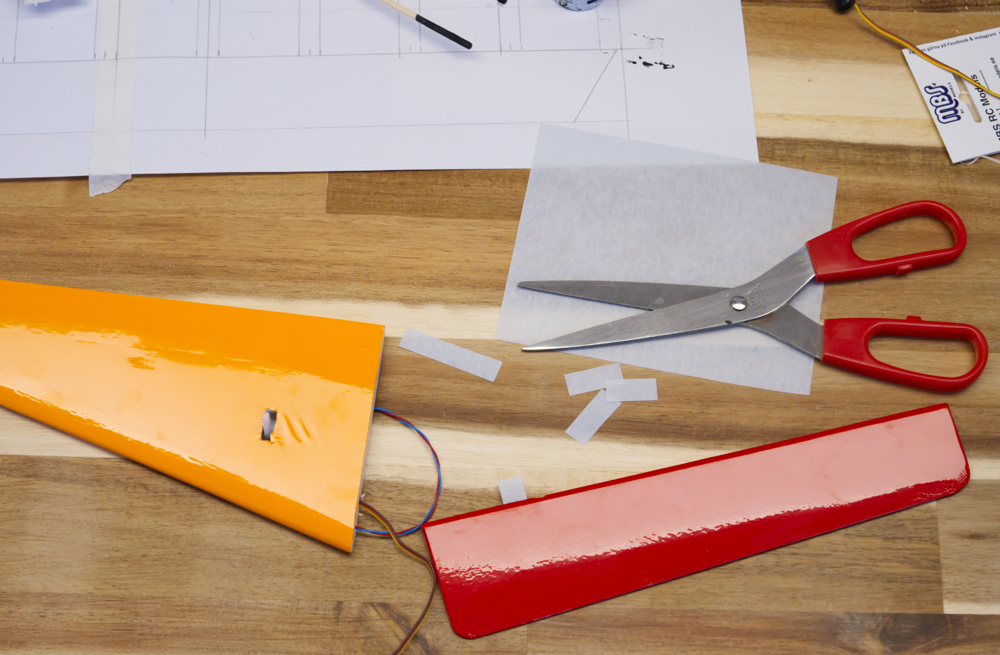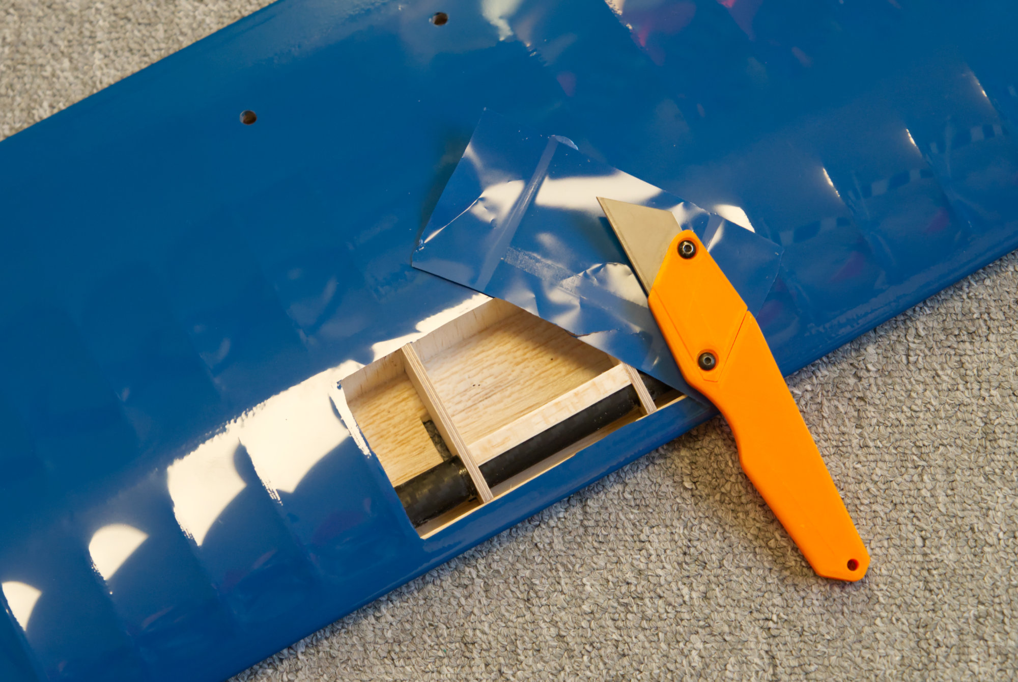 Motorspantet målade jag med svart hobbyfärg, lite för pilligt att komma åt att stryka på film där. Tyvärr gick det lite för fort, så jag glömde limma in krokarna som håller vingen på plats innan jag klädde ovansidan, så det var bara att skära upp igen och fixa. Blev ju bra ändå.