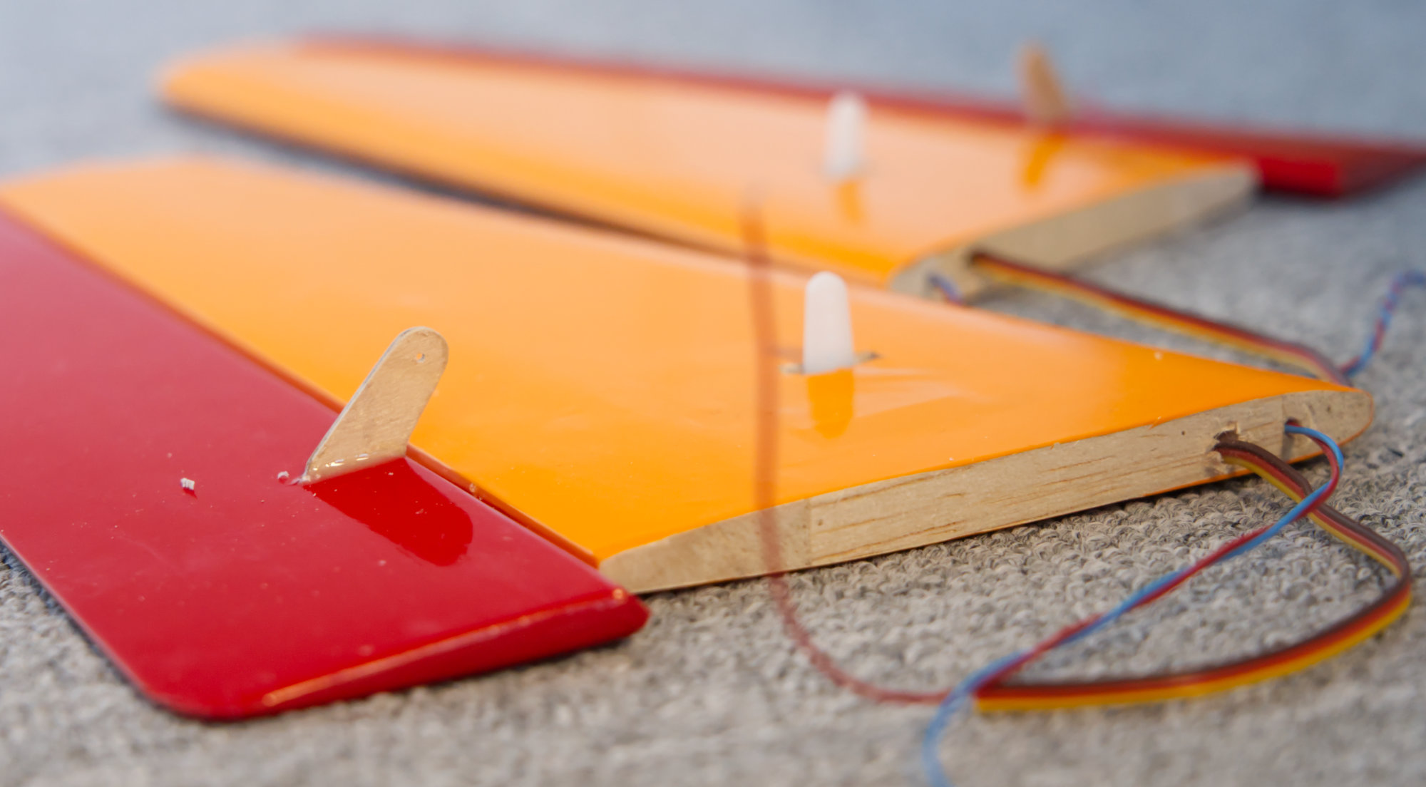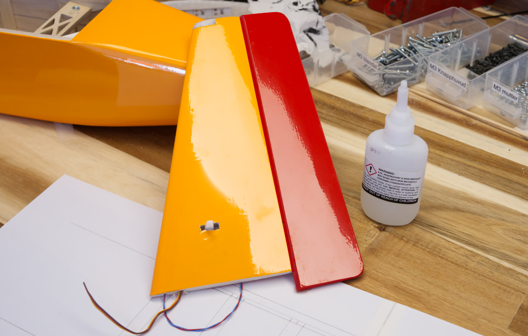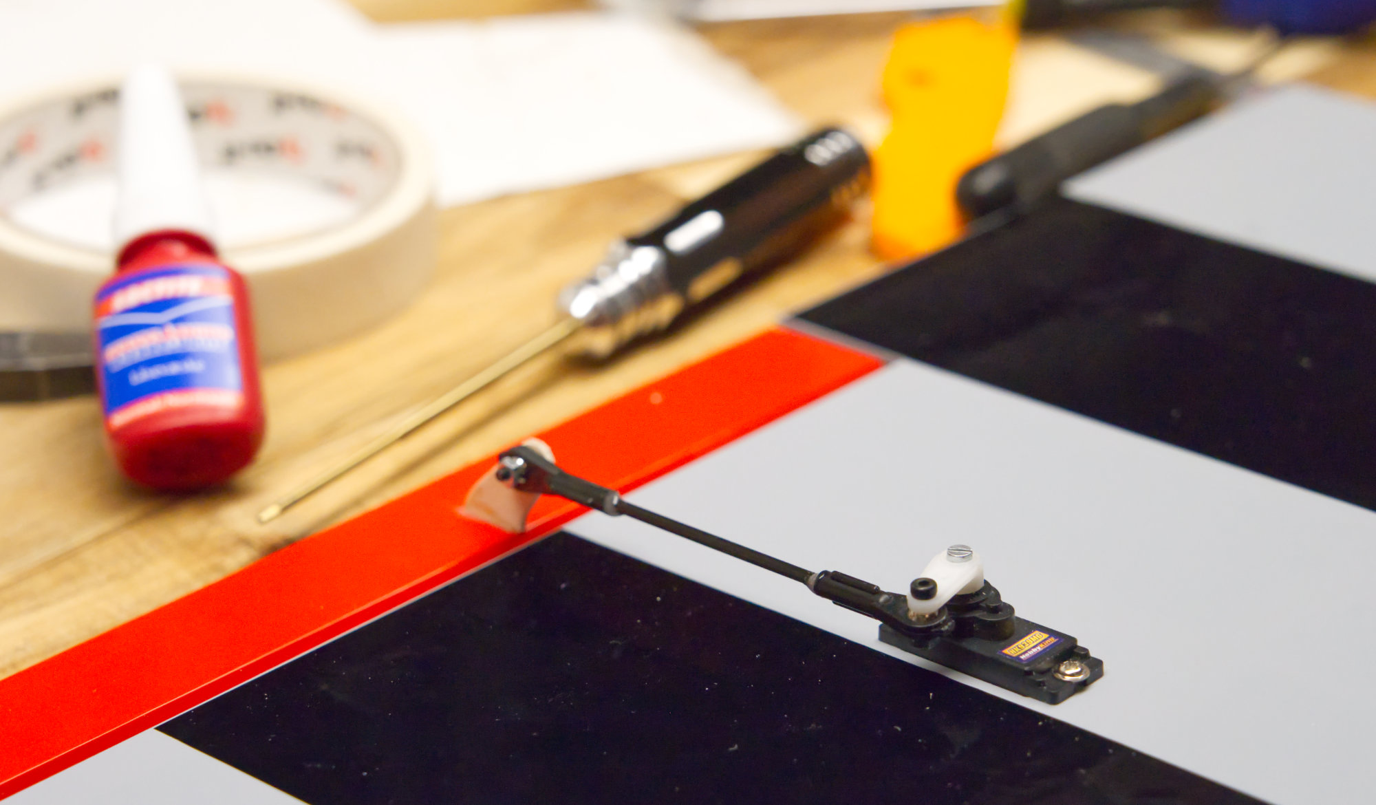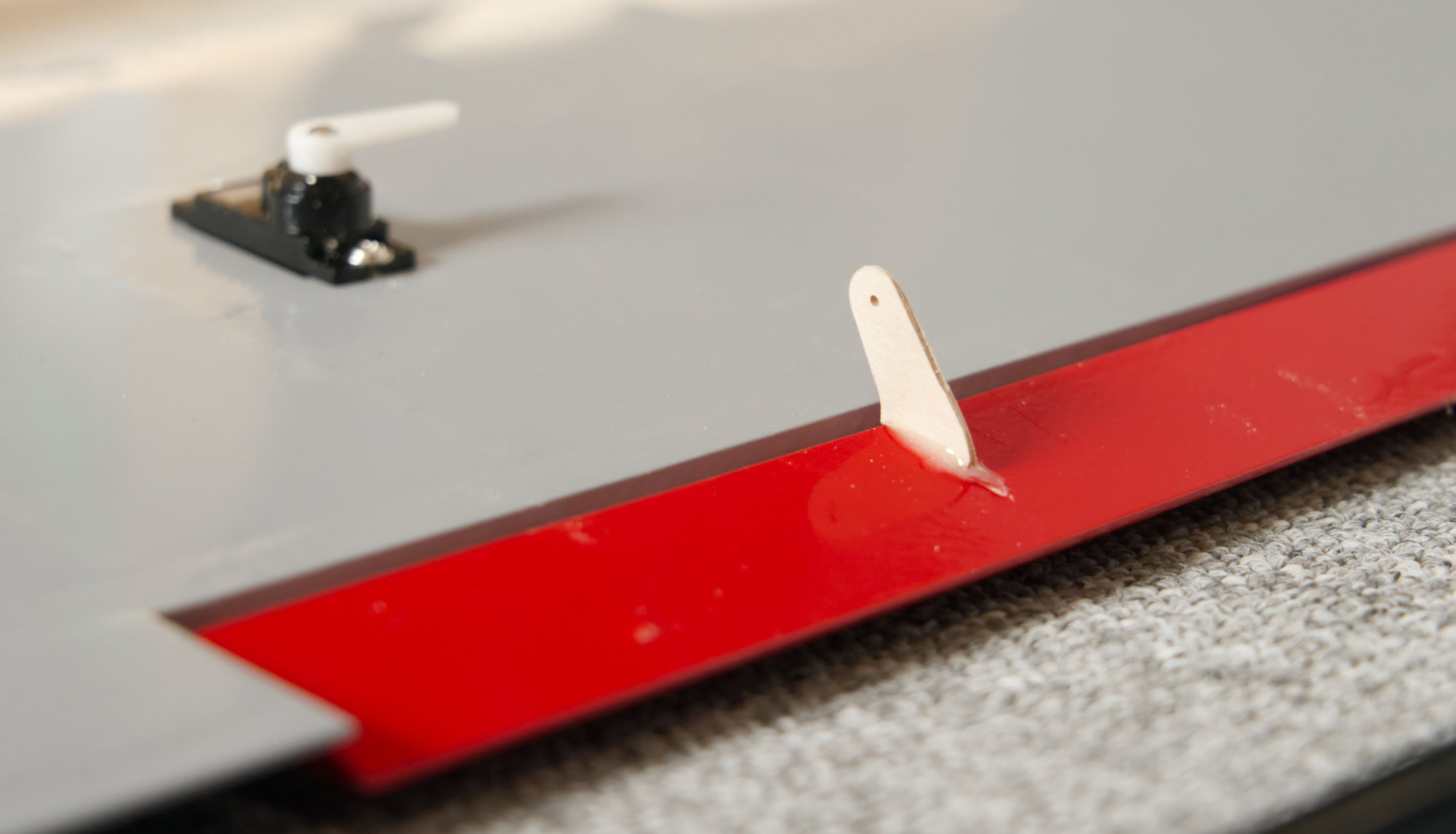 Roderhornen tillverkade jag av tun plywood. Skar ut dem med min CNC färs. En liten skåra gjordes med kniv i balsan, roderhornen slipades lite spetsiga i nedkant, sedan limmades de fast med 30 min epoxy. Min tanke är att använda små kullänkar både vid servona och roderhornen för att få till ett nästan helt glappfritt linkage.