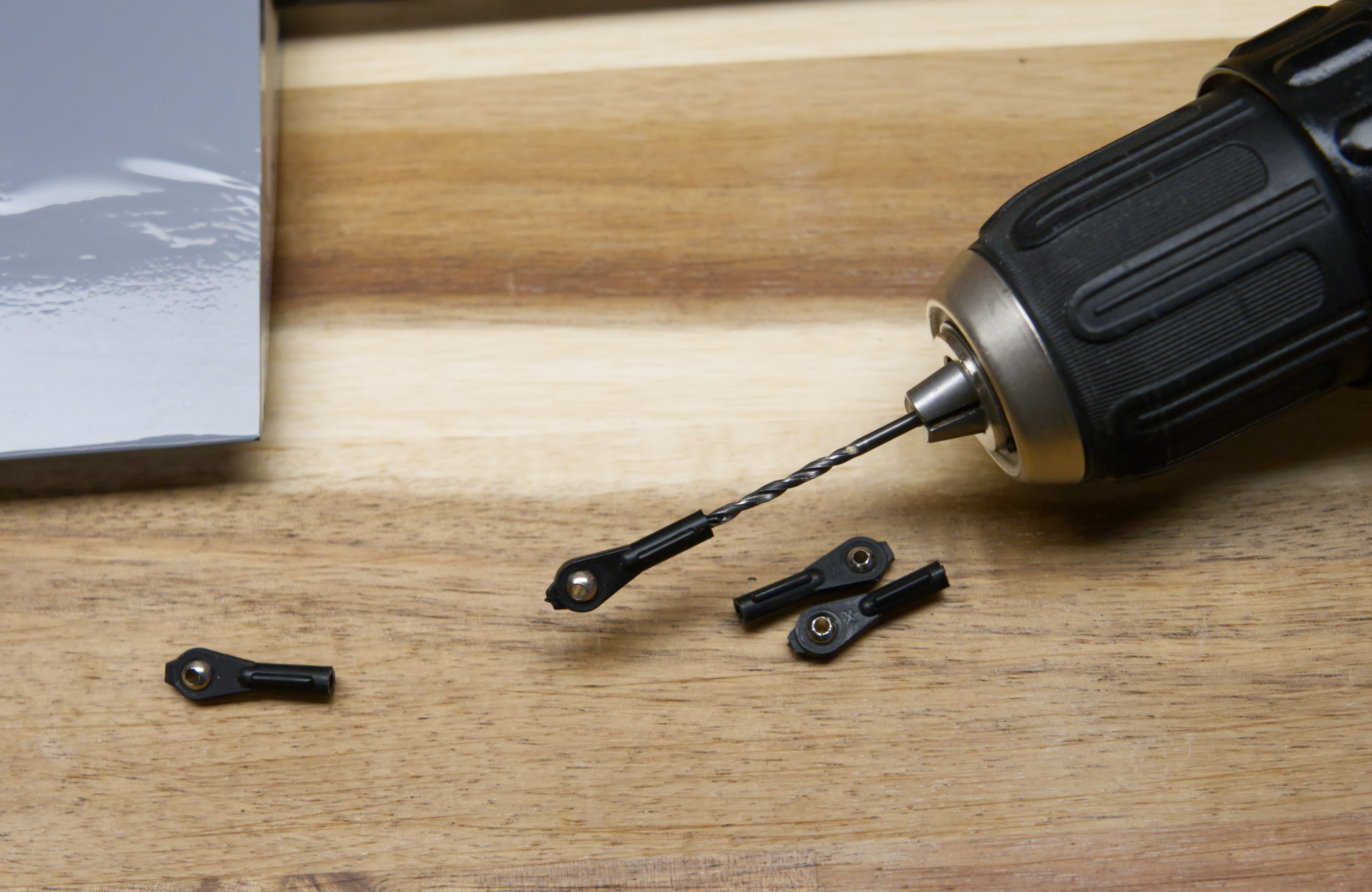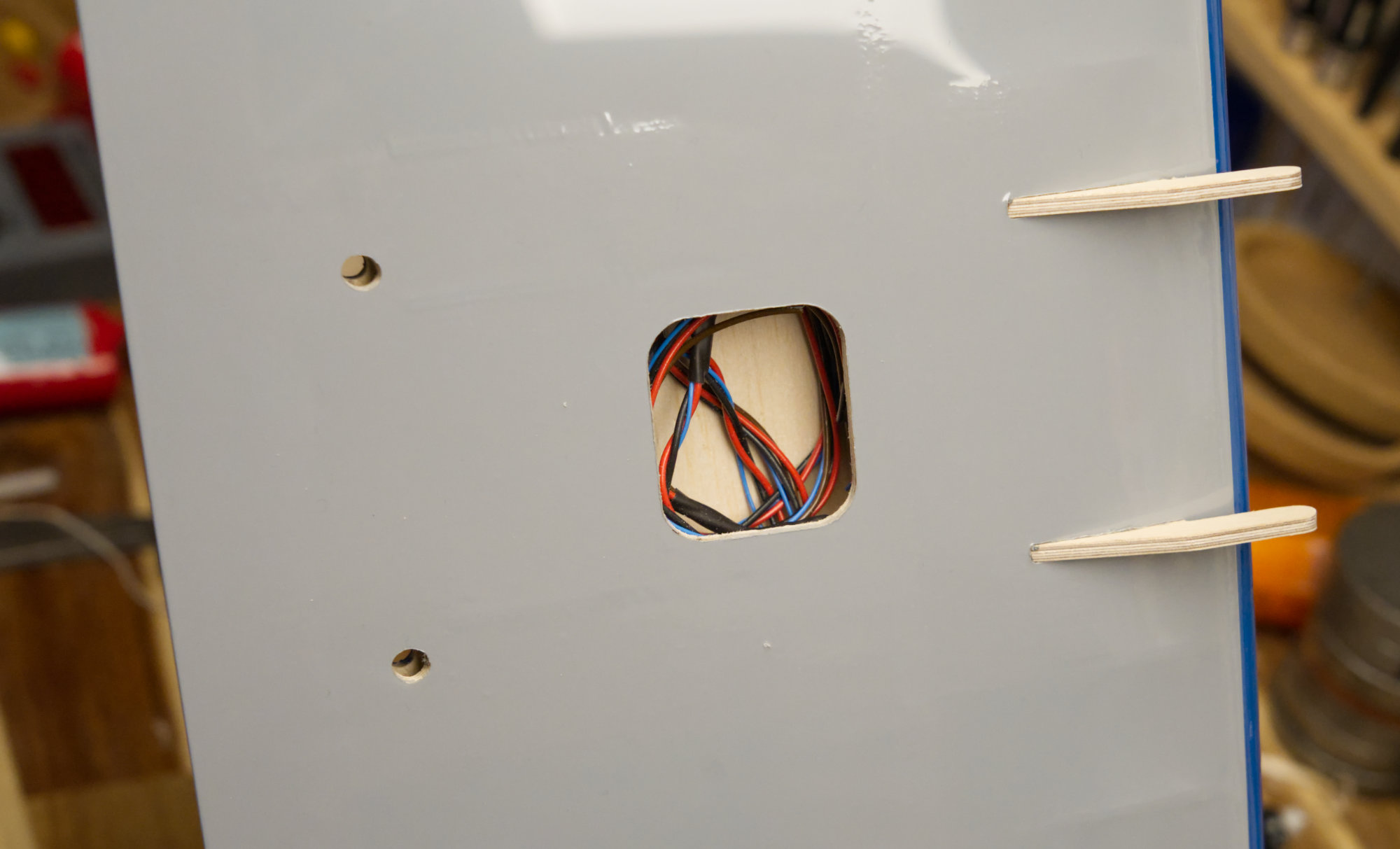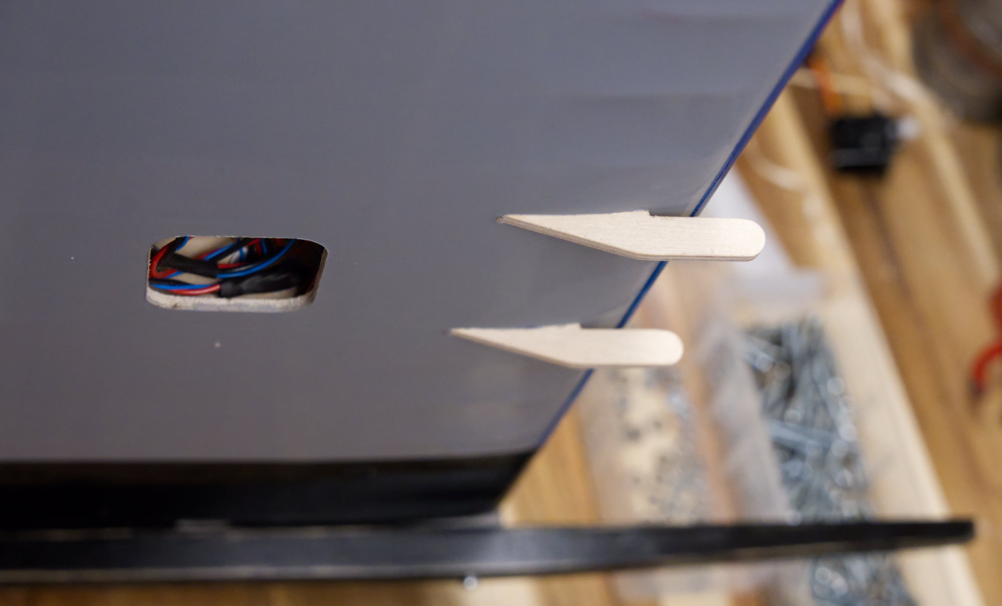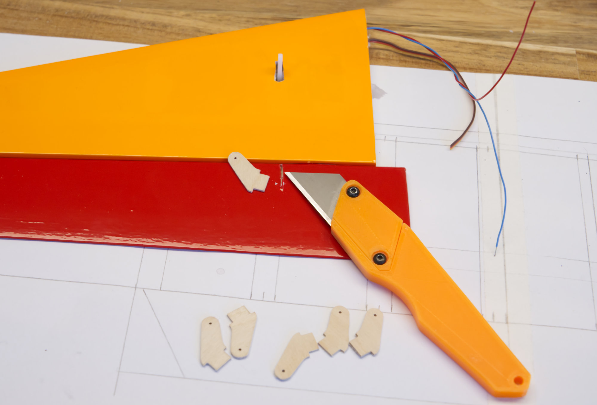 Roderhornen tillverkade jag av tun plywood. Skar ut dem med min CNC färs. En liten skåra gjordes med kniv i balsan, roderhornen slipades lite spetsiga i nedkant, sedan limmades de fast med 30 min epoxy. Min tanke är att använda små kullänkar både vid servona och roderhornen för att få till ett nästan helt glappfritt linkage.