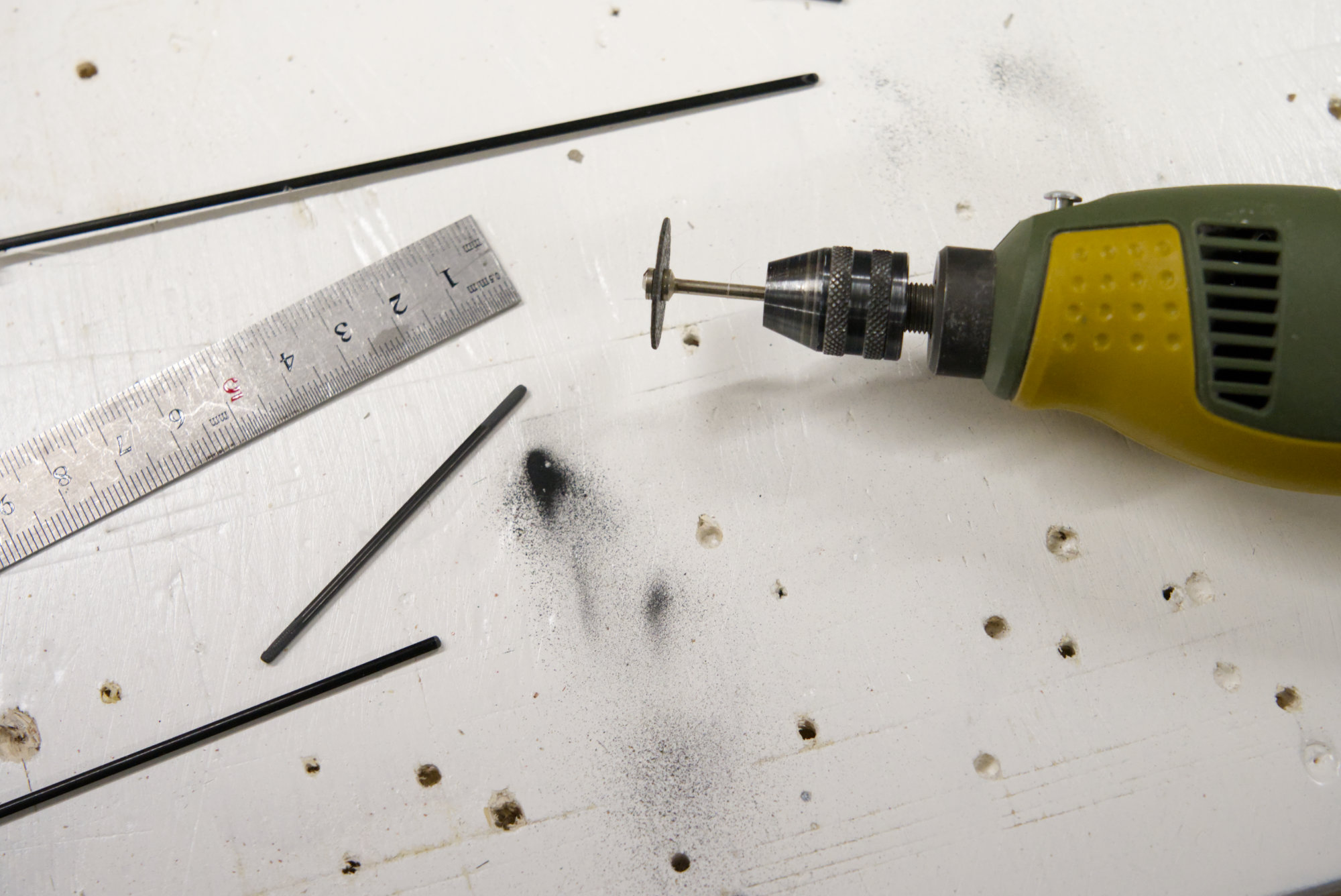 Sedan rodergångjärn. Här använde jag gångjärns-ark i plast som klipptes till lagom stora bitar. Bara att skära skåror och trycka in. Efter provpassning sätter jag in dem halvvägs och lägger en droppe lättflytande CA-lim på båda sidorna på alla gångjärnen samtidigt och trycker in rodret på plats.