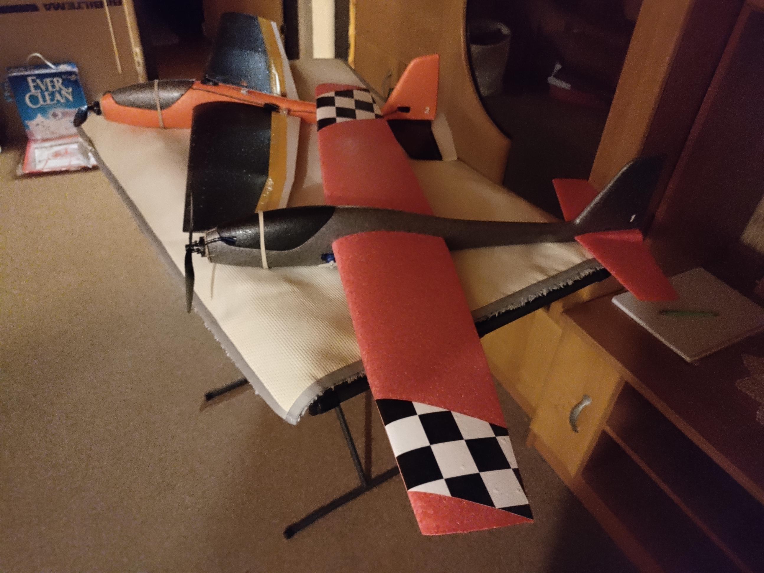 Det svart-oranga har normala roder av depron, det röd-grå har "Swing Wing"-konfiguration med deltamix.