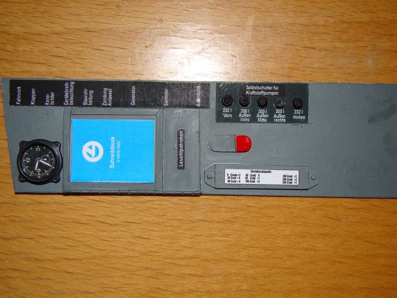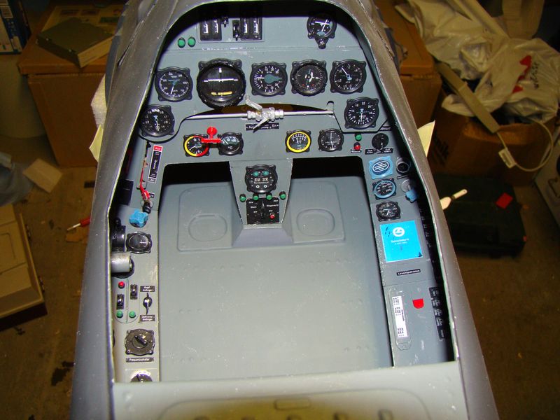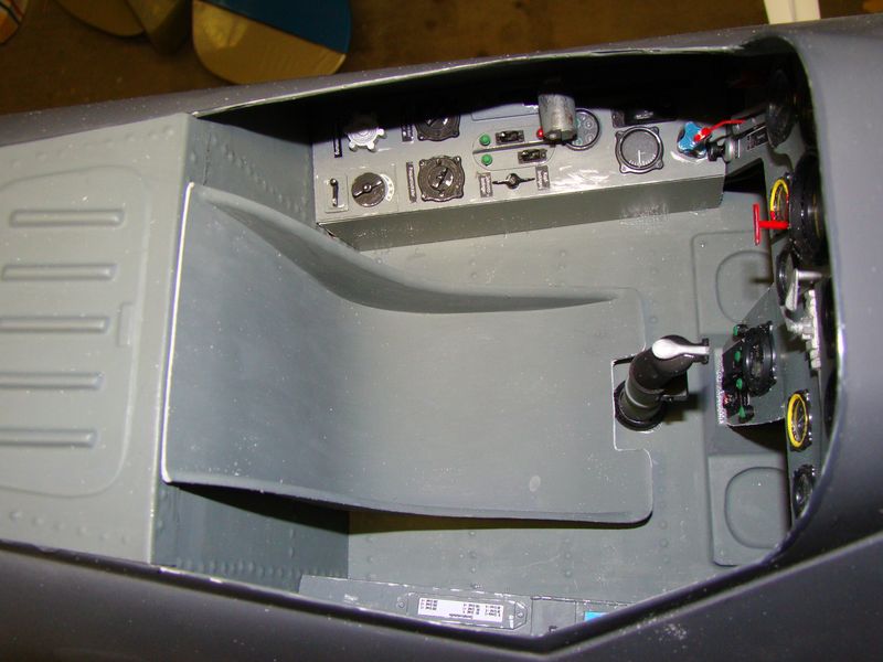 Sedan vill jag påpeka på en gång att jag är väl medveten om att panelerna är aningen för stora, det vet jag, samt att sidopanelerna är för låga och ihop komprimerade, det vet jag också. Märks framför allt på vänsterpanelen där den blå ratten nästan krockar med en knapp på instrumentpanelen. Men min målsättning var att göra en så skala lik cockpit jag bara kunde, och min besvikelse över kvaliten på Dynamic Balsa kittet jag först köpte var så katastrofalt dålig så det var värt pengarna att köpa detta något förstora InZpan kitt.