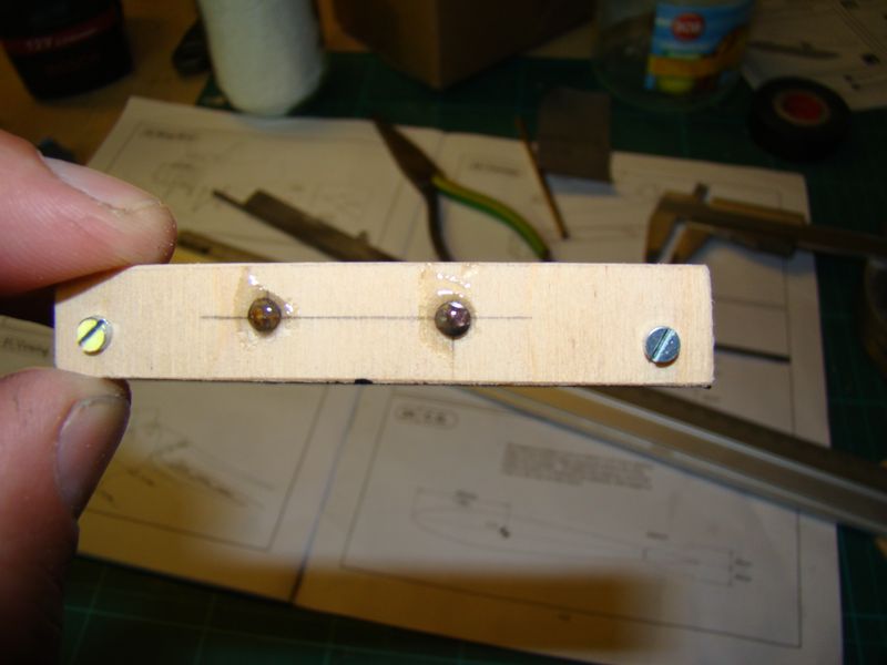 Bild4: Själva låsplattan. M2 skruvarna ytterst kommer limmas i mässingsrören som utgör kanonerna på nosen. Nubben i mitten kommer kapas av och blir själva låset mot spantet i luckan. Behåller spetsarna tills det blir dags att markera och borra hålen i spantet.
