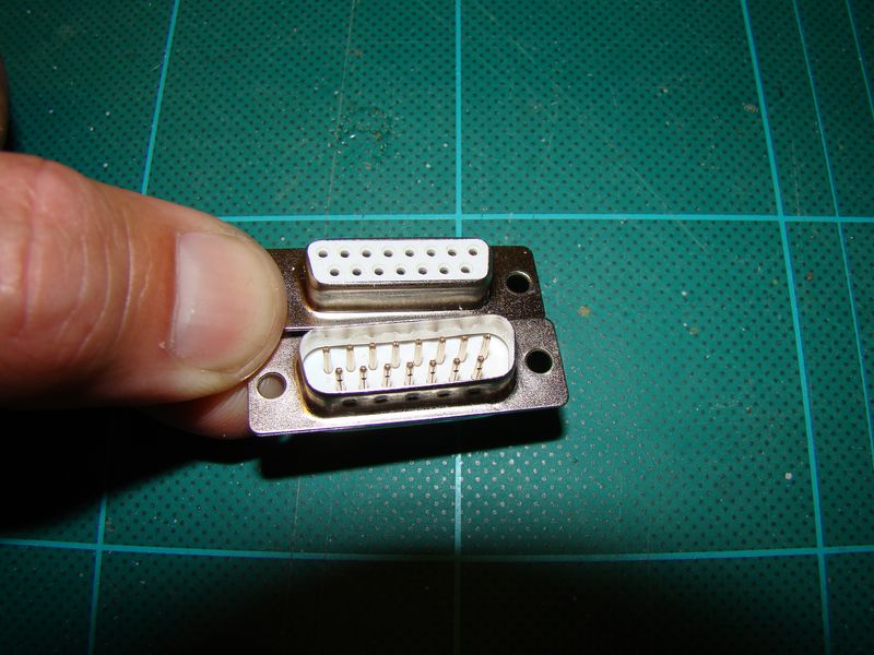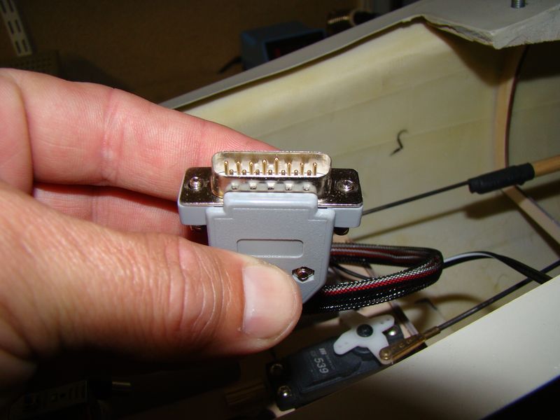 Jag använder D-Sub 15, då får man plats med upp till fem servon i en sådan kontakt. Finns även nio och tjugofem. Jag köper dom på Kjell & Co och dom kostar 17kr st. Kåpan kostar också 17kr.