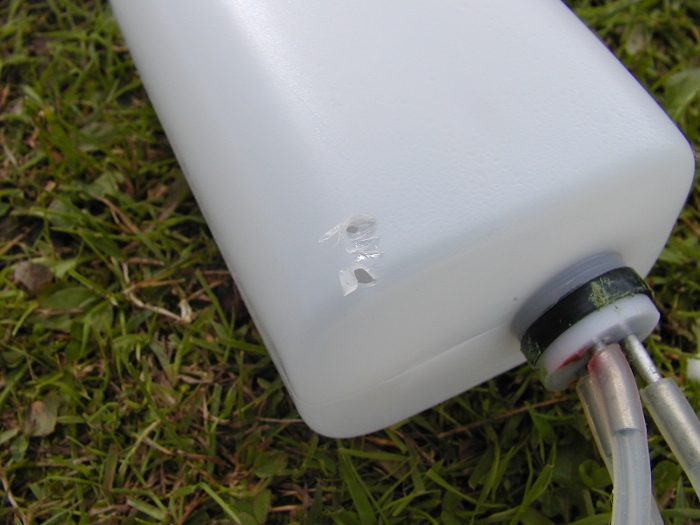 Skruvar isär modellen, skummgummit runt ackar är dyngsurt. Lite pyssel för att få ur tanken, men ser vad som är orsak till läckaget. Två hål i tanken, troligen uppkomna när hålet för stötstången till motorn borrades i motorspantet.