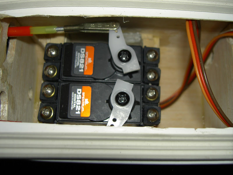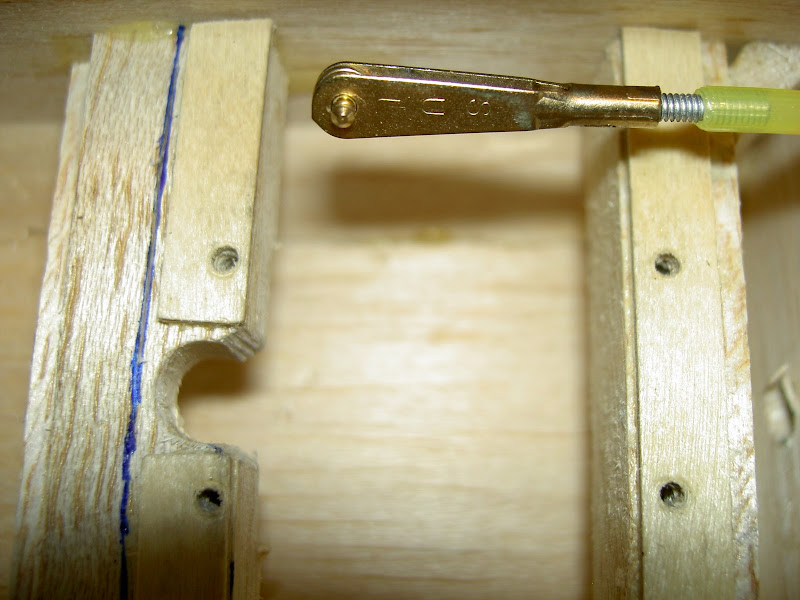 Medans jag funderade på hur jag skulle göra med motorkåpan så satte jag igång med servo montering. det visade sej att bryggan var anpassad för servon av någon udda format. eftersom jag hade ett antal standard servon liggande och seftersom att jag inte är den rikaste modellflygaren i världen så fick det även här bli lite modifiering. kapade ena fästet vid den blå linjen, tog bara ca två timmar eftersom det visade sej att delarna var i ruggigt hårt trä och ordentligt limmade