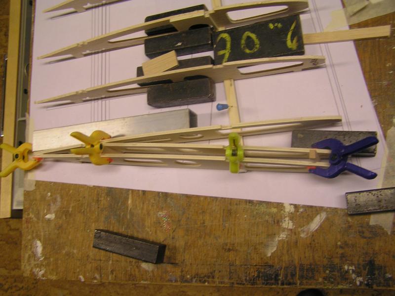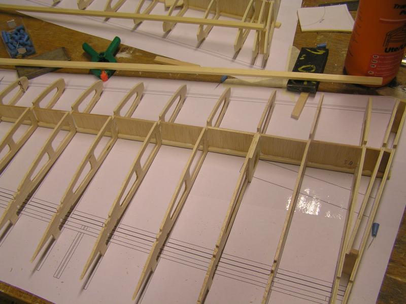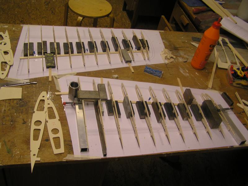 Vingbalken är uppbyggd med 5x10 furulister och 3mm hård balsawebb i mellan,