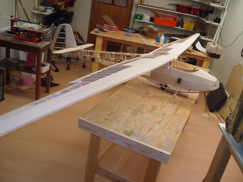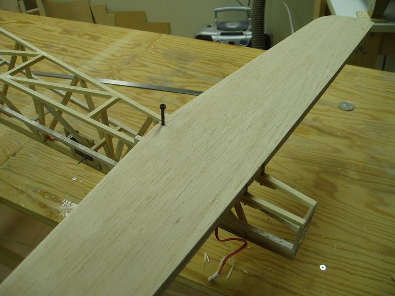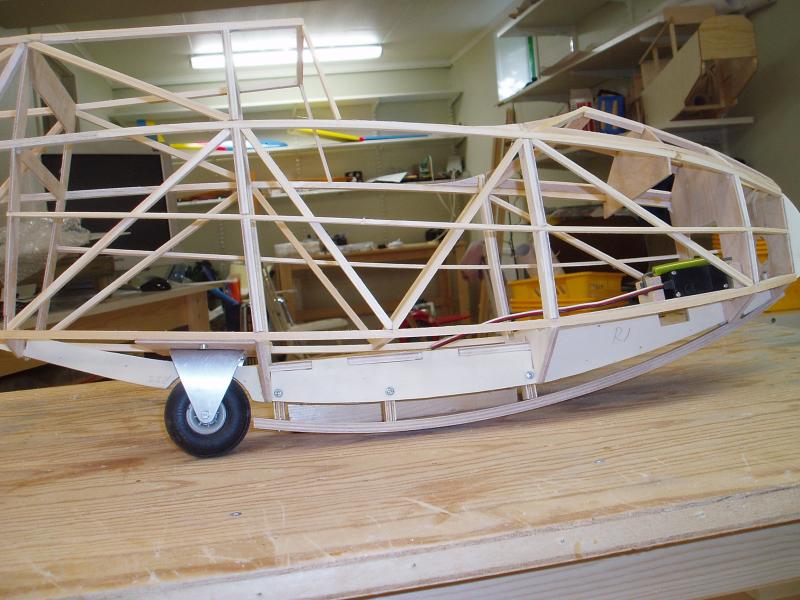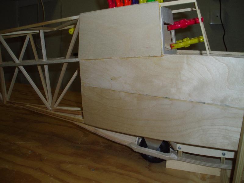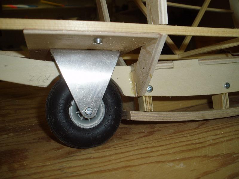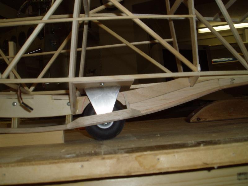 Enligt ritningen så skall det bara vara en skida på modellen och det är tydligen så att de första Spatzarna som byggdes inte hade något hjul. Men den Spatz som jag flög (SE-TCF) hade hjul därför har det blivit en smärre modifiering, det är klart att det skall vara hjul på modellen. Monterade också en plåt för att ta upp sjuvningskrafterna från hjulet.