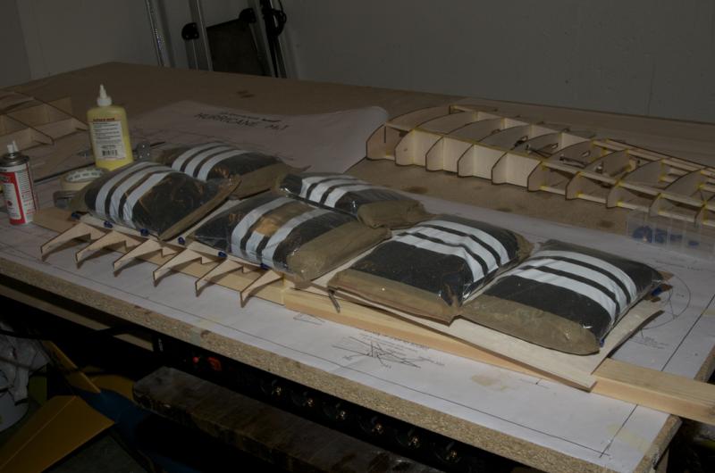 Nu har jag börja planka vingarna, nu får inte servona paja då blir det inte kul pga dolda linkaget, gjorde några påsar som vikter, använde Biltemas blästersand, fungerar kanon bra.:yu: