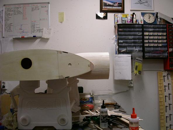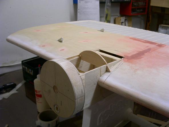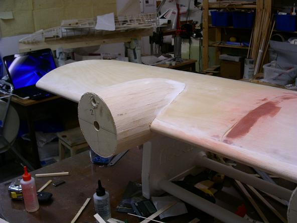 Jag gjorde några saker i utrymmet som nu är inklätt. Jag limmade dit ett par balsa klossar som stöd åt vingen där den möter kroppspylonen. Men den kommer att synas när jag öppnar upp luckan som jag skall ha på ovansidan av vingen.