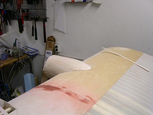 Så har plankningen på själva vingen kommit på plats. Vingframkanten har limmats på plats och slipats till rätt form. En del lättvikts spackel har lagt längs med framkanten.