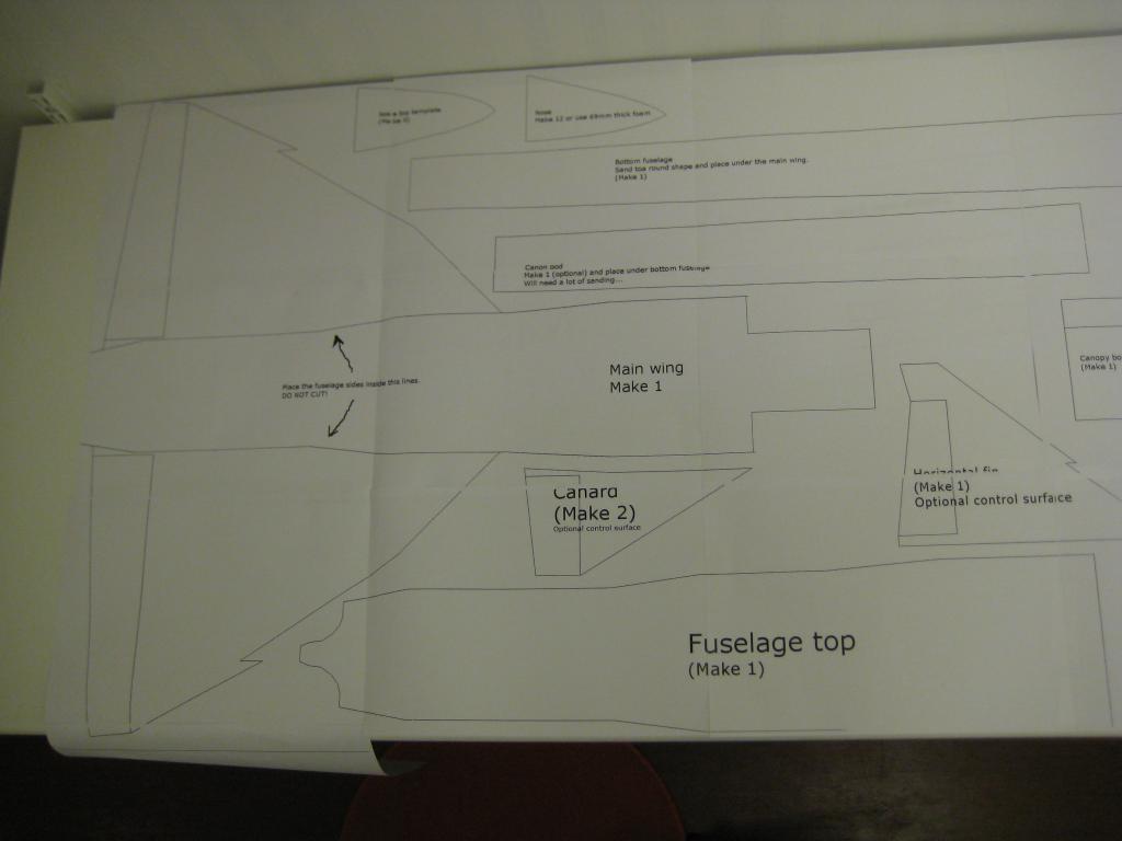 För något år sedan gjorde jag en liten prototyp i 3mm depron. Jag skrev då ut en toppvy på en A4-sida och skar ut delarna efter den. Den modellen friflög så bra att jag förra året byggde en variant för inomhusflygning.