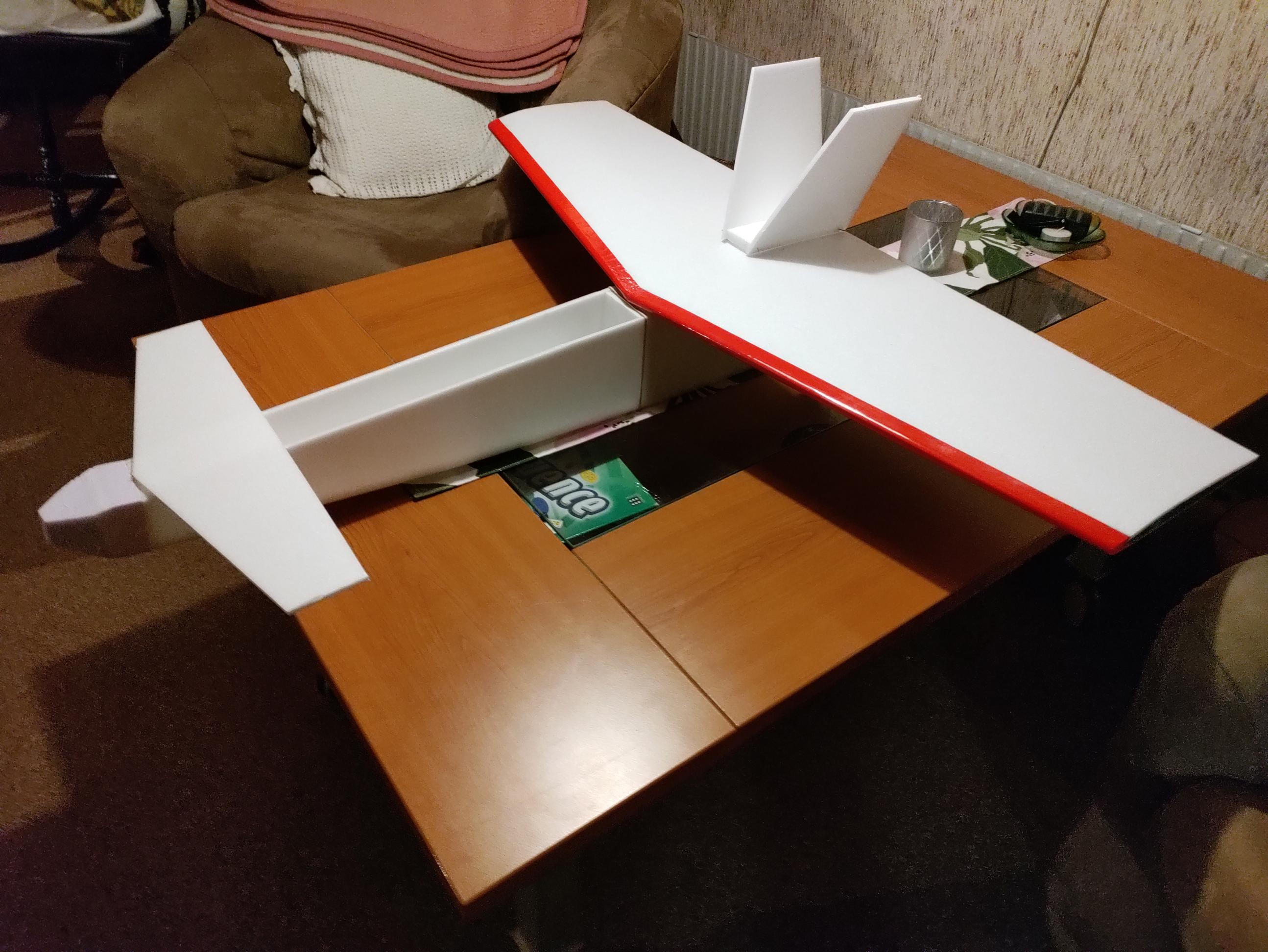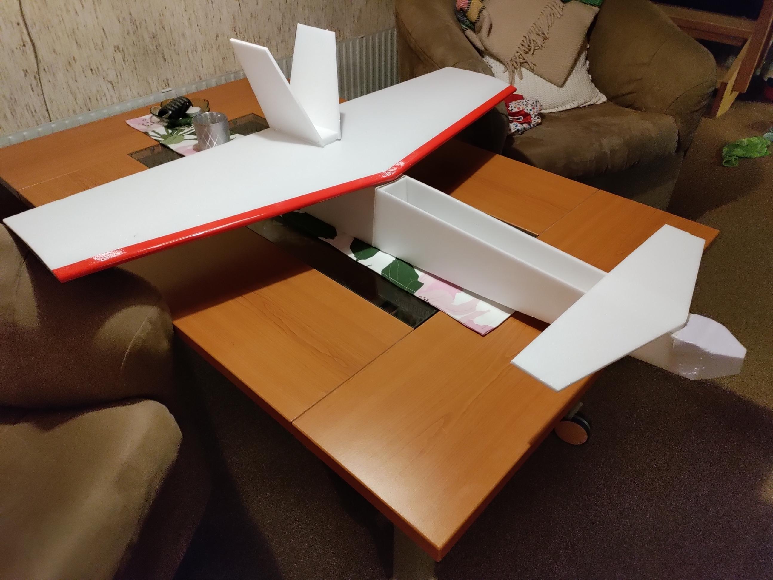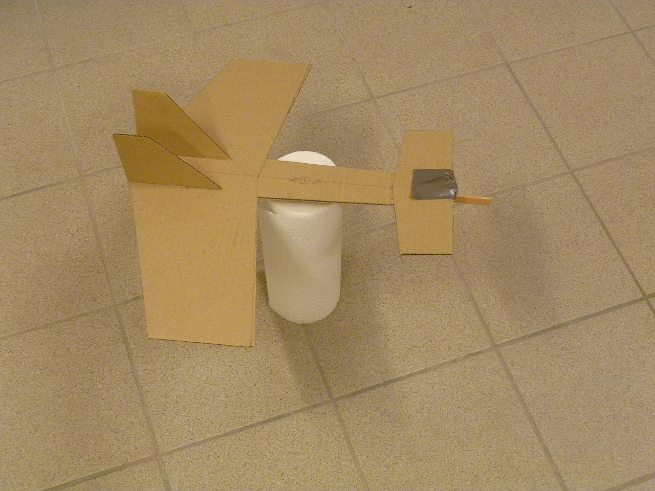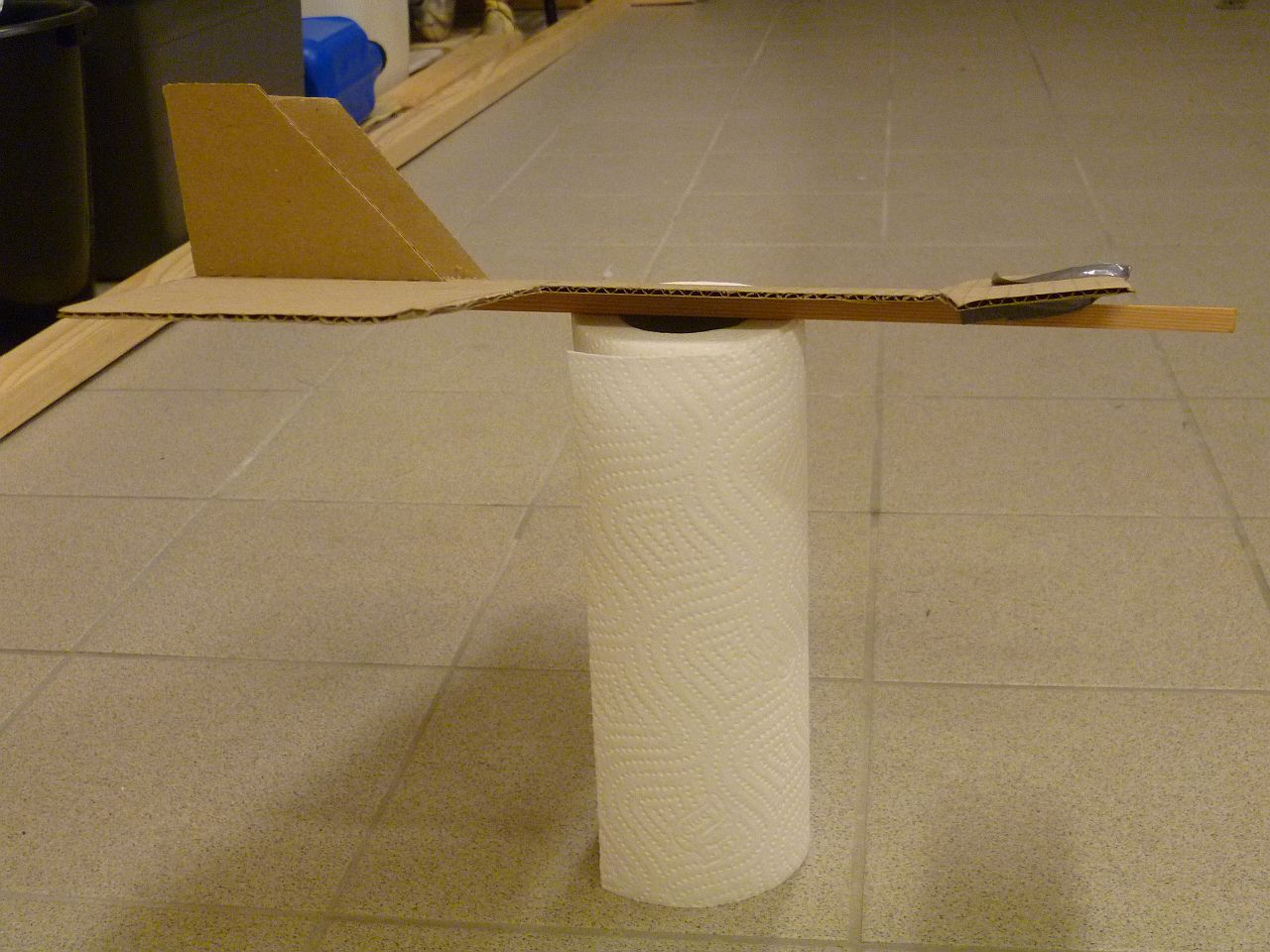 När jag dimensionerade min lilla Depron-PuPu som syns i gyrotråden så gjorde jag en kastmodell av wellpapp. Det finns en furupinne längs kroppens undersida. I nosen tejpade jag fast små tyngder för att få CG på önskat ställe. Framkanten av nosvingen är uppallad för att få nödvändig anfallsvinkelskillnad. Det gick faktiskt att verifiera beräkningarna med detta enkla hjälpmedel.
