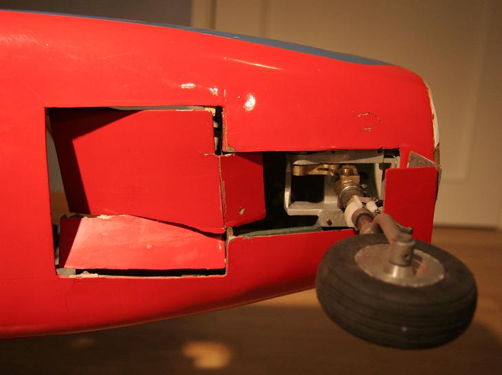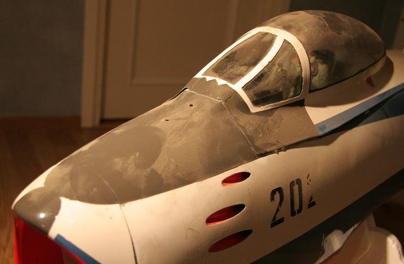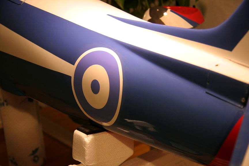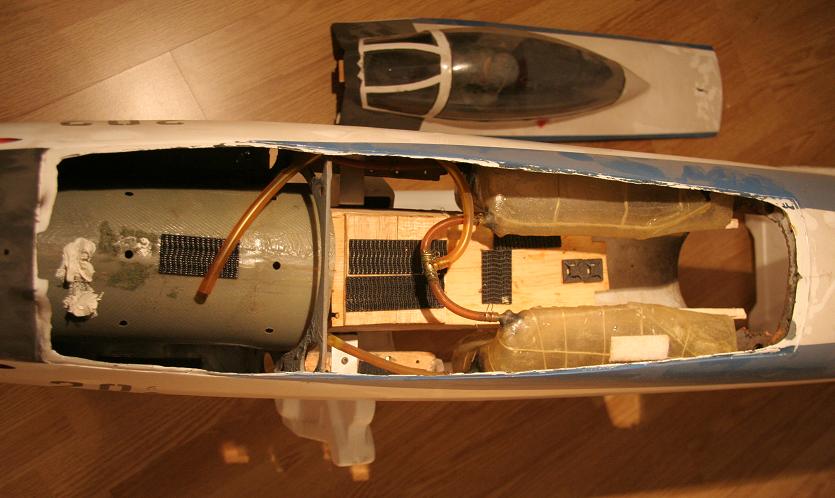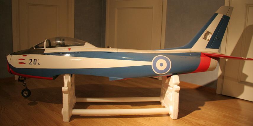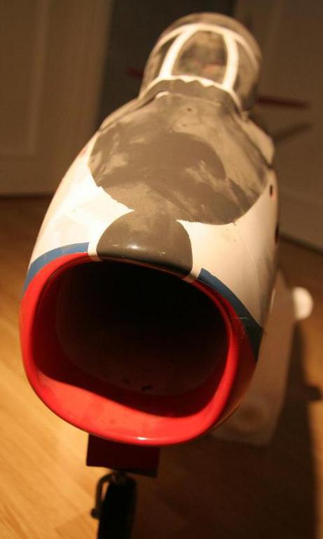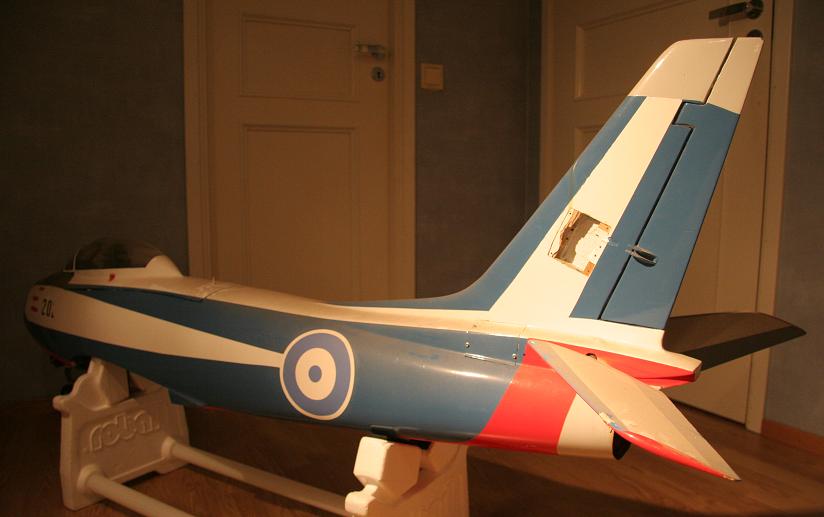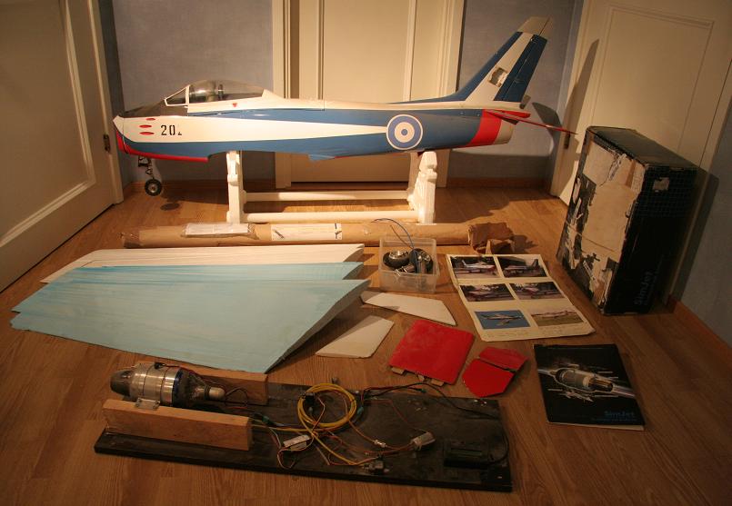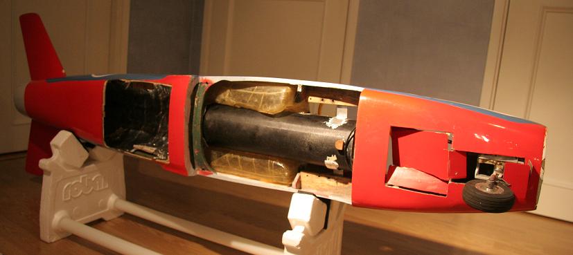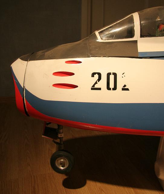 Flyget är skalabyggt verkar det som, till och med siffrorna på flyget är lika "skadade" på modellen som på fotona på originalet (riktiga flyget). Infällbara landställ. Motorn är komplett med FADEC o allt. En stor dunk A1 Jetfuel står i förrådet med olja och det som saknas är resten av elektroniken. Och en detalj till... vingar har den inte, men jag har ritningarn och färdigutskurna vingar i två olika material. =) Projekt alltså... Flyget är vitt med blå ränder, svart på nosen och röd undersida. Det enda som står på flyget på fotona är 202 på sidan. Säger mig inget... Flyget ser ut som en brugd!