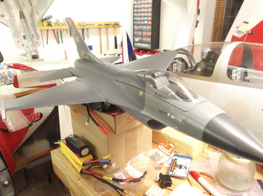 Jag har en F-16 gjort i et skumliknande material. Ganska skala lik. Mäter: 85cm lång och 65cm i spv.