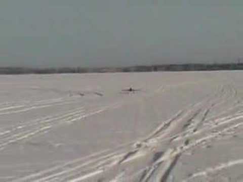 Anade att det skulle bli svårt att få ner Sukhoien utan att skidorna skulle träffa någon stor ojämnhet i snön och så blev det också. Första flygningen höll skidorna vinkeln bra, men jag lyckades träffa ett spår från en fyrhjuling så det blev tvärstopp och ena skidfästet gick sönder. Limmade med tjockt CA och tog upp planet på en andra flygning. Nu vibrerade hjulbultarna loss och gummibanden drog upp skidorna i en grotesk vinkel (märkes inte alls på flygförmågan - kärran flög lika stabilt ändå). Lyckades igen träffa någon grop i snön, och gav upp. Det fick bli Twisten istället.