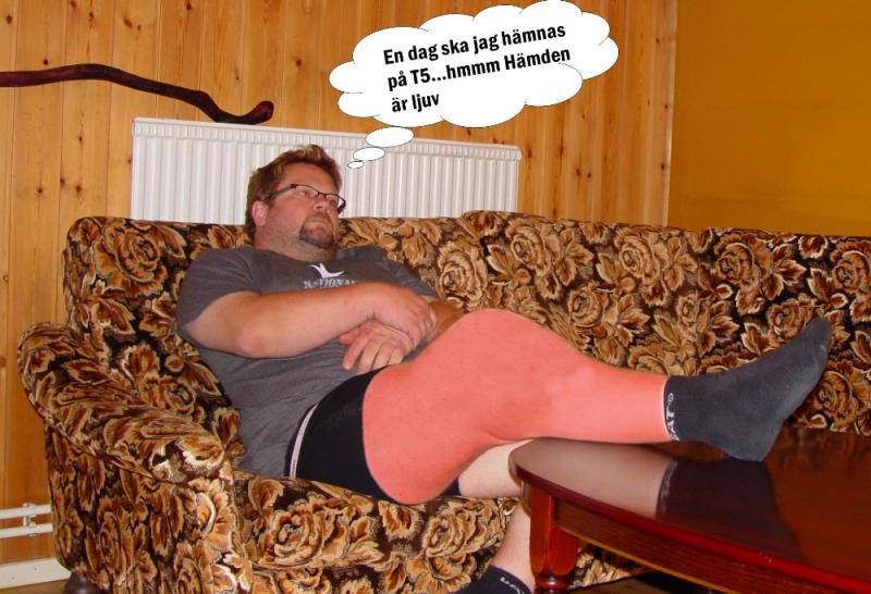 Sitter här med ett uppsvullet rött högerknä o det har jag T5 att tacka för...Motion endorfiner det är nyttigt bla bla bla...ska nog åka övet te han o köra hans plan i backen